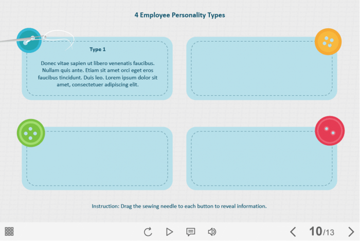 Draggable Needle — Captivate Template. The eLearning interaction slide would become a great addition for your eCourse. It contains 1 draggable object designed as a needle and 4 target areas designed as buttons. The user must drag and drop a needle on each button to reveal the additional information. The template is compatible with Adobe Captivate 9 and higher tool version. All you need is just to paste the template into your project and to fill it with own learning materials. Try to create better courses with our amazing templates!