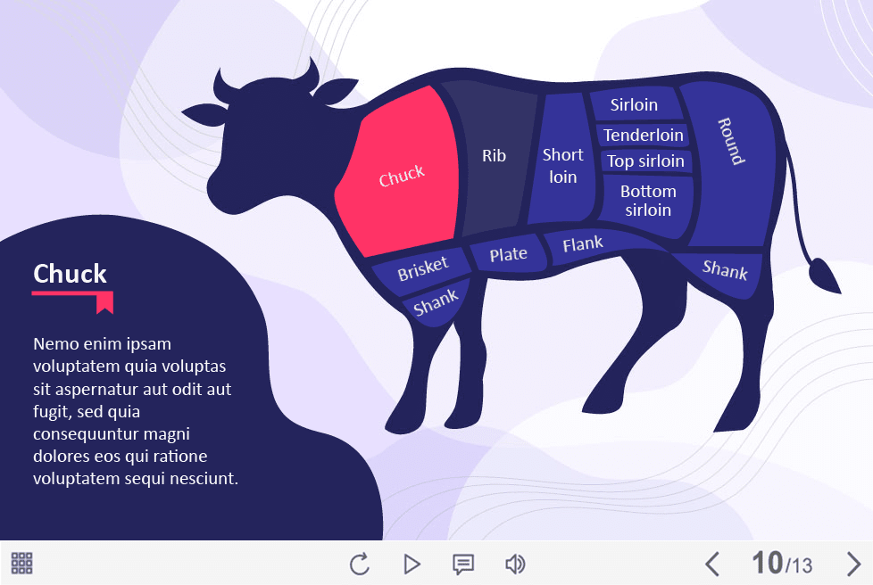 Cut of Beef — Captivate Template. The eLearning interaction slide would become a great addition for your eCourse. It contains 13 clickable objects designed as cuts of cow. The user must click on part of cow to reveal the additional information. The template is developed with Adobe Captivate 9 authoring tool. It is compatible with Captivate 2017 / 2019 version. All you need is just to paste the template into your project and to fill it with own learning materials. Try to create better courses with our amazing templates!