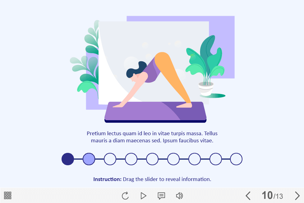 Yoga Slider — Captivate Template. The eLearning interaction slide would become a great addition for your eCourse. It contains a slider with 9 positions. The user must drag a slider to each next position to reveal the additional information. The template is developed with Adobe Captivate 9 authoring tool. It is compatible with Captivate 2017 / 2019 versions. All you need is just to paste the template into your project and to fill it with own learning materials. Try to create better courses with our amazing templates!