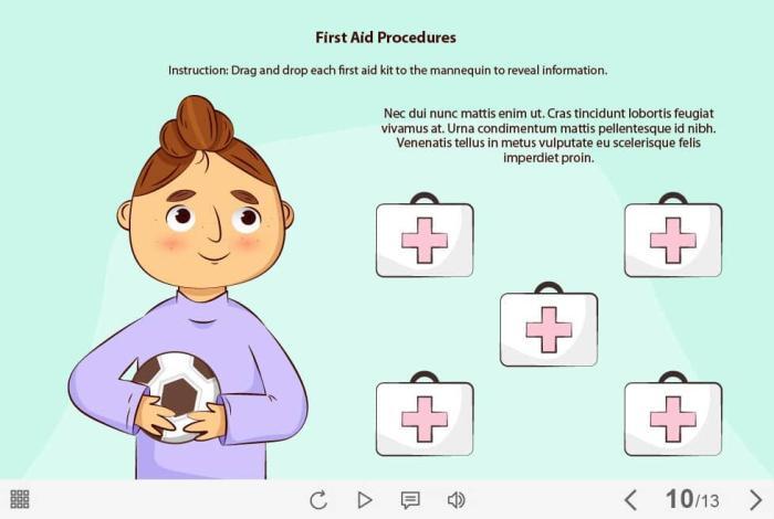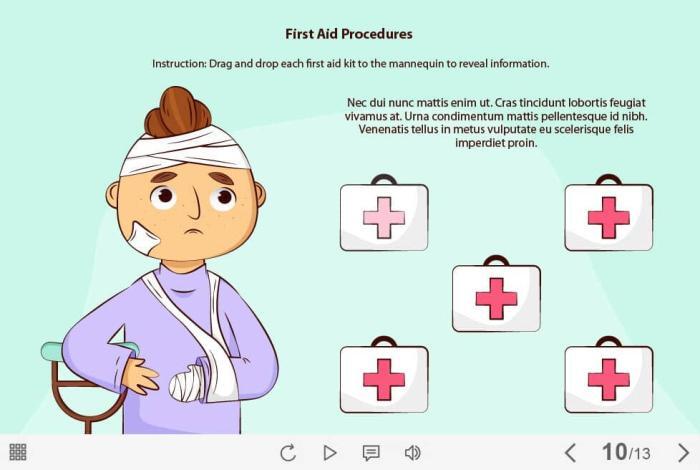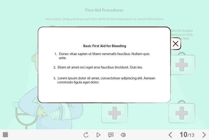 First Aid Procedures — Captivate Template. The eLearning interaction slide would become a great addition for your eCourse. It contains 5 draggable objects designed as first aid kits. The user must drag each of them on a character to reveal the additional information in pop-ups. The template is compatible with Captivate 2019 software. All you need is just to paste the template into your project and to fill it with own learning materials. Try to create better courses with our amazing Adobe Captivate templates!