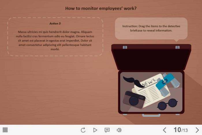 Detective Suitcase — Captivate Template. The eLearning interaction slide would become a great addition for your eCourse. It contains 5 draggable objects placed in the left part of the screen. The user must drag and drop each of them on a suitcase to reveal the additional information. The template is compatible with Captivate 2019 software. All you need is just to paste the template into your project and to fill it with own learning materials. Try to create better courses with our amazing Adobe Captivate templates!