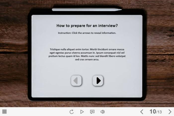 Tablet Slideshow — Captivate Template. The eLearning interaction slide would become a great addition for your eCourse. It represents a classic slideshow with 6 slides. The user must click on the right and left arrows to reveal the additional information. The template is compatible with Captivate 2019 software. All you need is just to paste the template into your project and to fill it with own learning materials. Try to create better courses with our amazing Adobe Captivate templates!