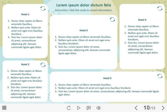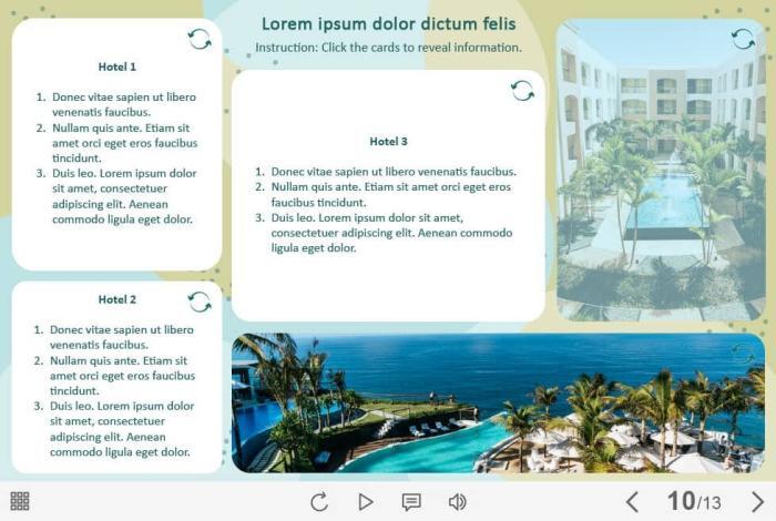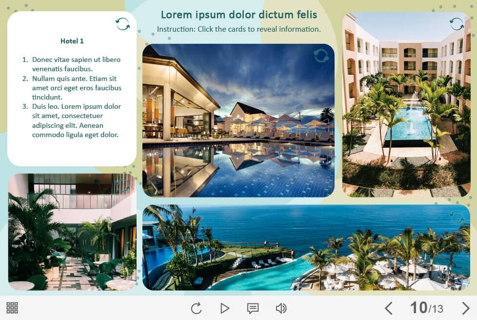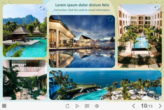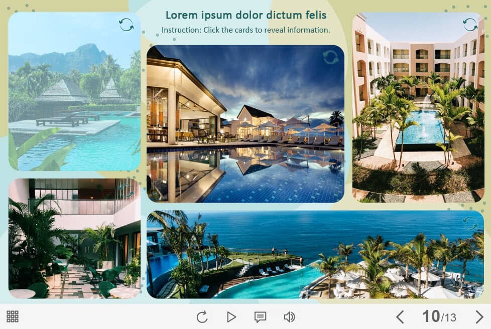 Hotel Flip Cards — Captivate Template. The eLearning interaction slide would become a great addition for your eCourse. It contains 5 flip cards with pictures of various hotels. The user must click on each of them to reveal the additional information. The template is compatible with Captivate 2019. All you need is just to paste the template into your project and to fill it with own learning materials. Try to create better courses with our amazing Adobe Captivate templates!