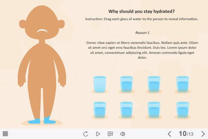 Drag and Drop Glasses — Captivate Template. The eLearning interaction slide would become a great addition for your eCourse. It contains eight draggable objects designed as glasses of water. The user must drag and drop each of them on a character to reveal the additional information. The template is compatible with Captivate 2019. All you need is just to paste the template into your project and to fill it with own learning materials. Try to create better courses with our amazing Adobe Captivate templates!
