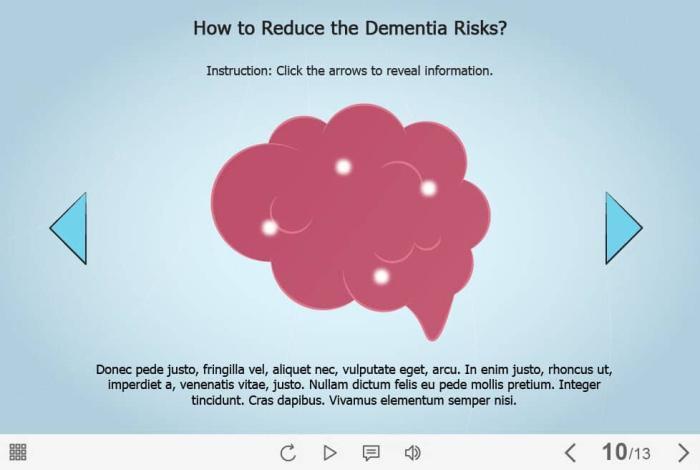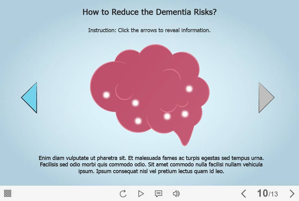 Reduce the Dementia Risks — Captivate Template. The eLearning interaction slide would become a great addition for your eCourse. It represents a classic slideshow with right and left arrows to switch between the slides. The user must click on the arrows to reveal the additional information. The template is compatible with Captivate 2019 software. All you need is just to paste the template into your project and to fill it with own learning materials. Try to create better courses with our amazing Adobe Captivate templates!