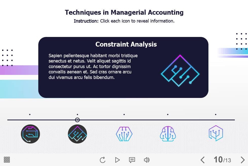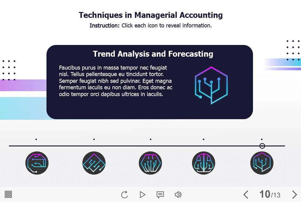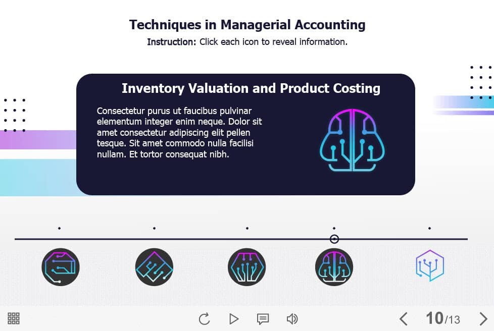 Managerial Accounting Techniques – Captivate Template. The eLearning interaction slide would become a great addition for your eCourse. It contains five clickable icons arranged on a horizontal timeline. The user must click on each icon to reveal the additional information. The template is compatible with Captivate 2019 software. All you need is just to paste the template into your project and to fill it with own learning materials. Try to create better courses with our amazing Adobe Captivate templates!