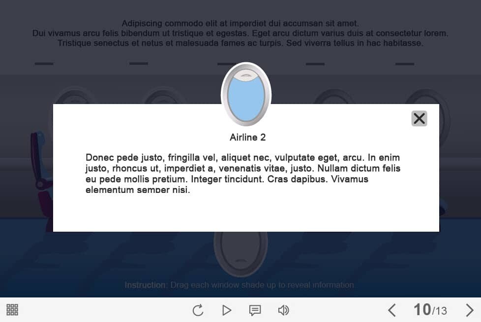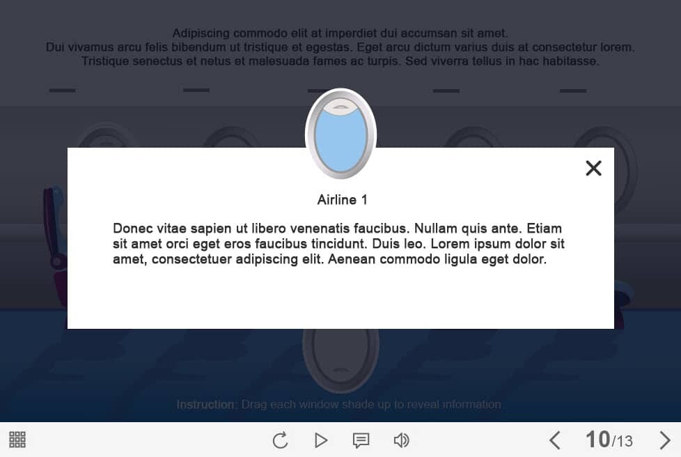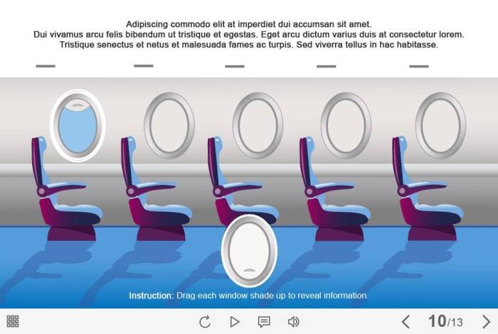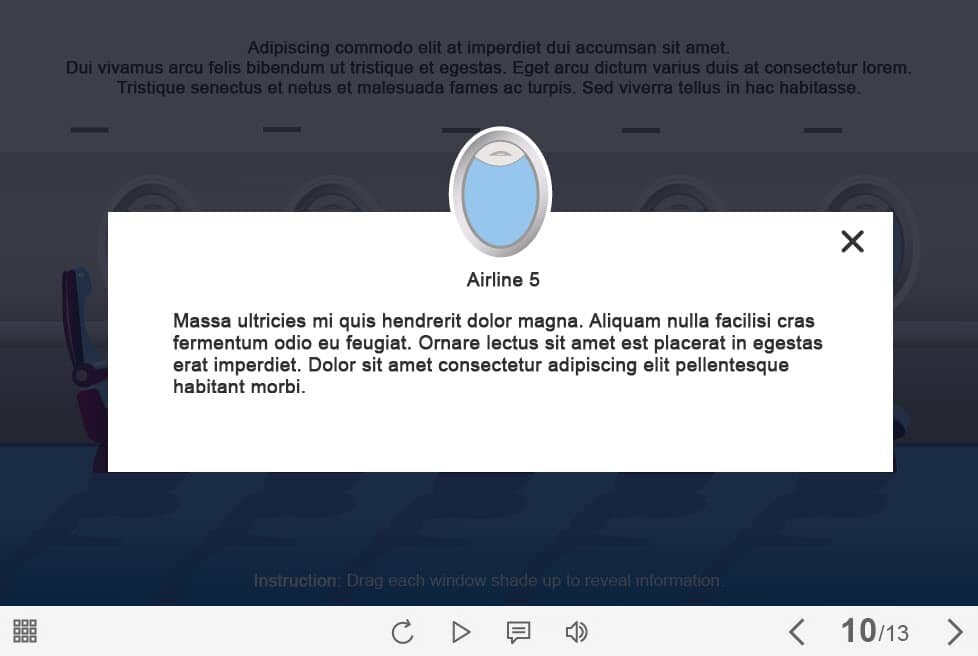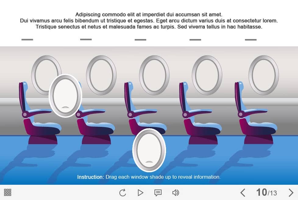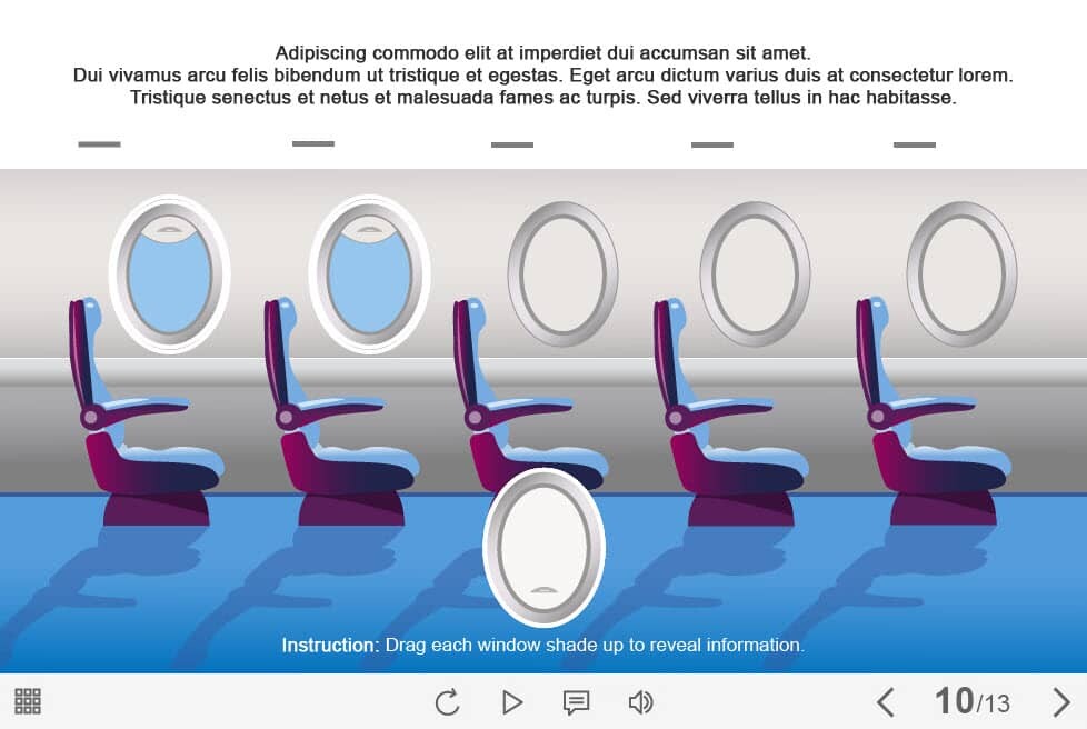 Clickable the Window Shades — Captivate Template. The eLearning interaction slide would become a great addition for your eCourse. It contains five clickable objects designed as window shade. The user must click on each of them to reveal the additional information in pop-ups. The template is compatible with Captivate 2019 software. All you need is just to paste the template into your project and to fill it with own learning materials. Try to create better courses with our amazing Adobe Captivate templates!