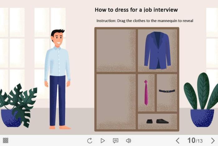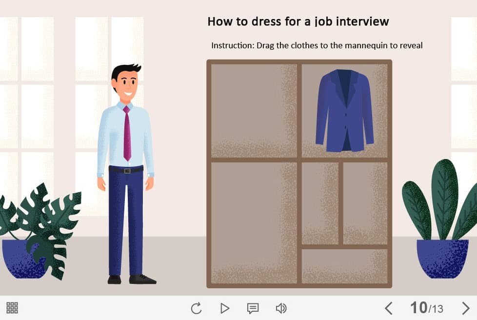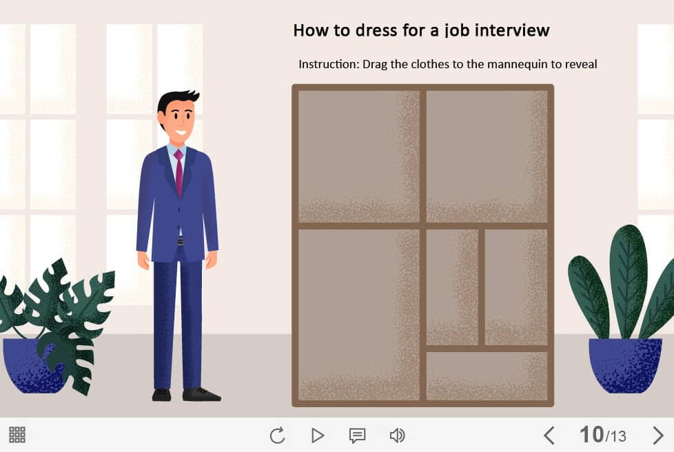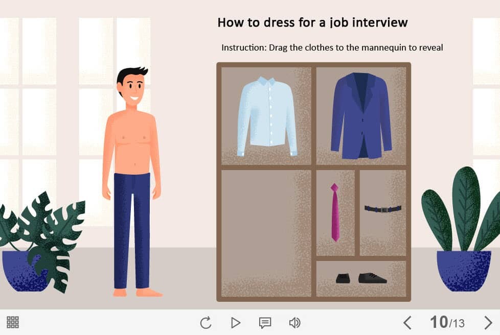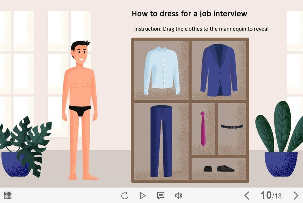 Draggable Clothes — Captivate 2019 Template. The eLearning interaction slide would become a great addition for your eCourse. It contains six draggable objects designed as various clothes. The user must drag and drop each of them on a character to reveal the additional information. The template is compatible with Captivate 2019 software. All you need is just to paste the template into your project and to fill it with own learning materials. Try to create better courses with our amazing Adobe Captivate templates!