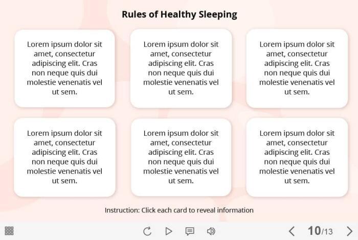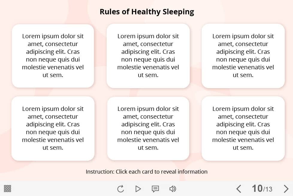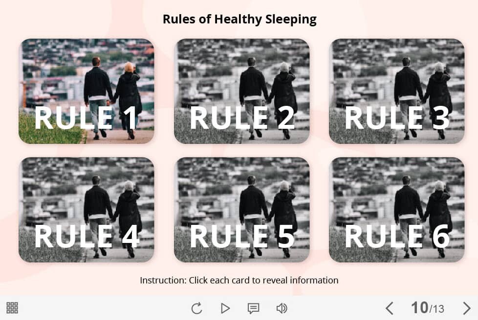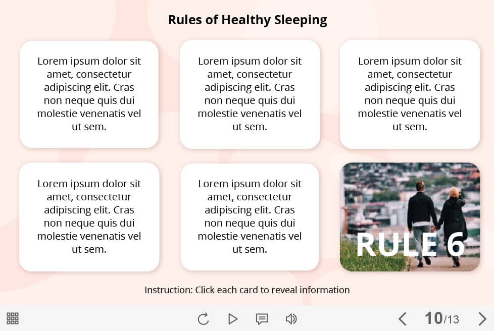 Rules of Healthy Sleeping — Captivate Template. The eLearning interaction slide would become a great addition for your eCourse. It contains six clickable images arranged in a grid. The user must click on each of them to reveal the additional information. The template is compatible with Captivate 2019 software. All you need is just to paste the template into your project and to fill it with own learning materials. Try to create better courses with our amazing Adobe Captivate templates!