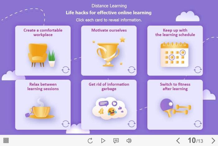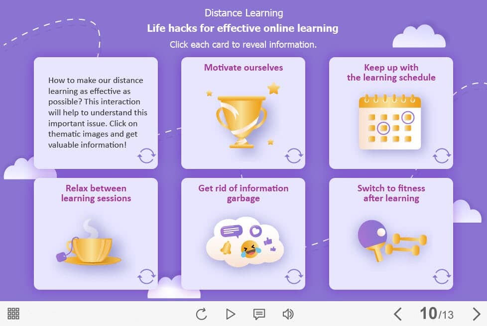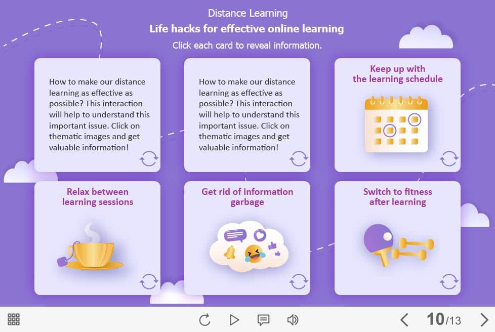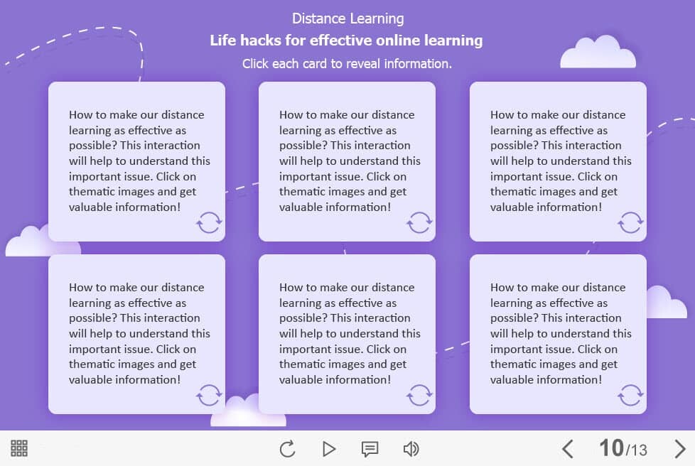 Effective Online Learning — Captivate Template. The eLearning interaction slide would become a great addition for your eCourse. It contains six flip cards that arranged in a 3×2 grid. The user must click on each of them to reveal the additional information. The template is compatible with Captivate 2019 software. All you need is just to paste the template into your project and to fill it with own learning materials. Try to create better courses with our amazing Adobe Captivate templates!