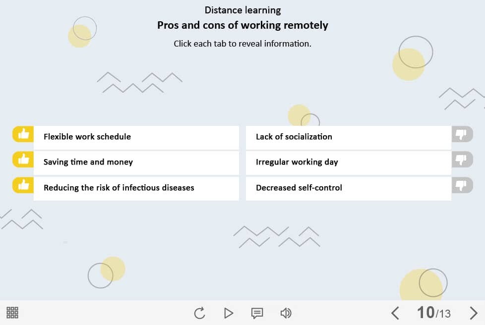 Pros and Cons of Remote Work — Captivate Template. The eLearning interaction slide would become a great addition for your eCourse. It represents an accordion with six tabs divided in two columns. The user must click on each tab to reveal the additional information. The template is compatible with Captivate 2019 software. All you need is just to paste the template into your project and to fill it with own learning materials. Try to create better courses with our amazing Adobe Captivate templates!