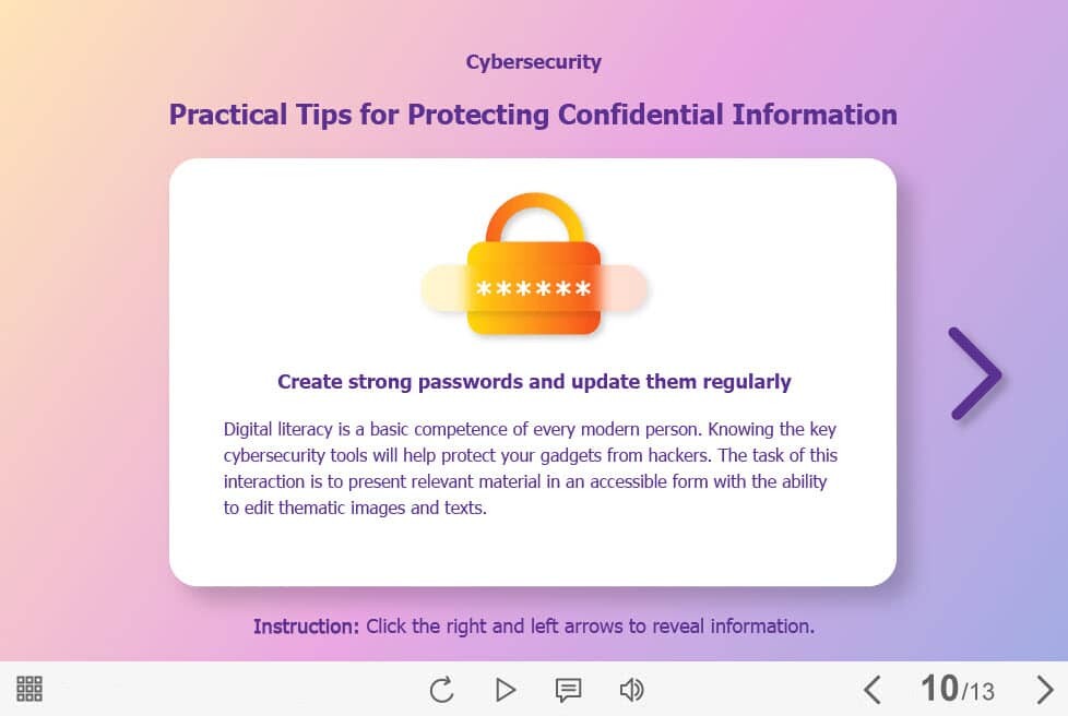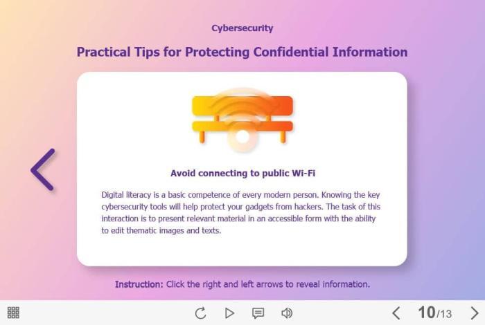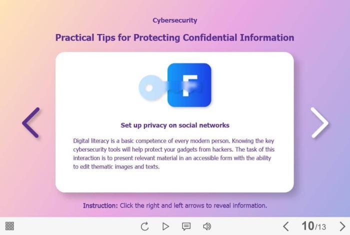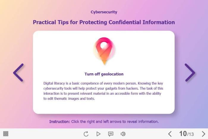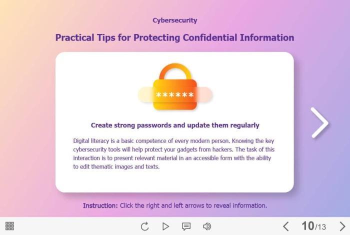 Protect Confidential Information — Captivate Template. The eLearning interaction slide would become a great addition for your eCourse. It represents a classic slideshow with nine slides. The user must click on the right and left arrows to switch between the slides and reveal the additional information. The template is compatible with Captivate 2019 software. All you need is just to paste the template into your project and to fill it with own learning materials. Try to create better courses with our amazing Adobe Captivate templates!