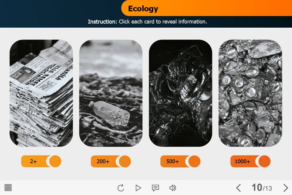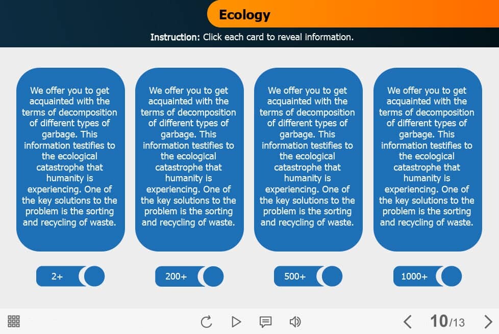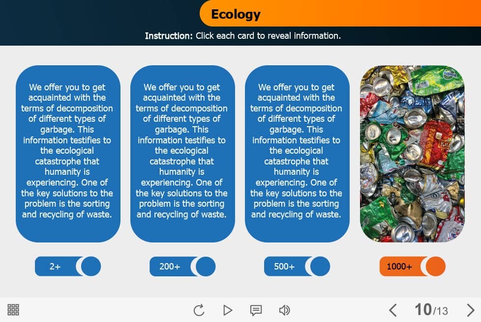 Waste Decomposition Periods — Captivate Template. The eLearning interaction slide would become a great addition for your eCourse. It contains four clickable cards. The user must click on each of them to reveal the additional information. The template is compatible with Captivate 2019 software. All you need is just to paste the template into your project and to fill it with own learning materials. Try to create better courses with our amazing Adobe Captivate templates!