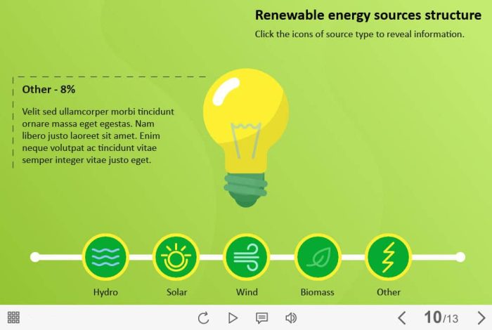 Renewable Energy — Captivate Template. The eLearning interaction slide would become a great addition for your eCourse. It contains five round buttons with icons that are placed at the bottom of the screen. The user must click on each of them to reveal the additional information. The template is compatible with Captivate 2019 software. All you need is just to paste the template into your project and to fill it with own learning materials. Try to create better courses with our amazing Adobe Captivate templates!