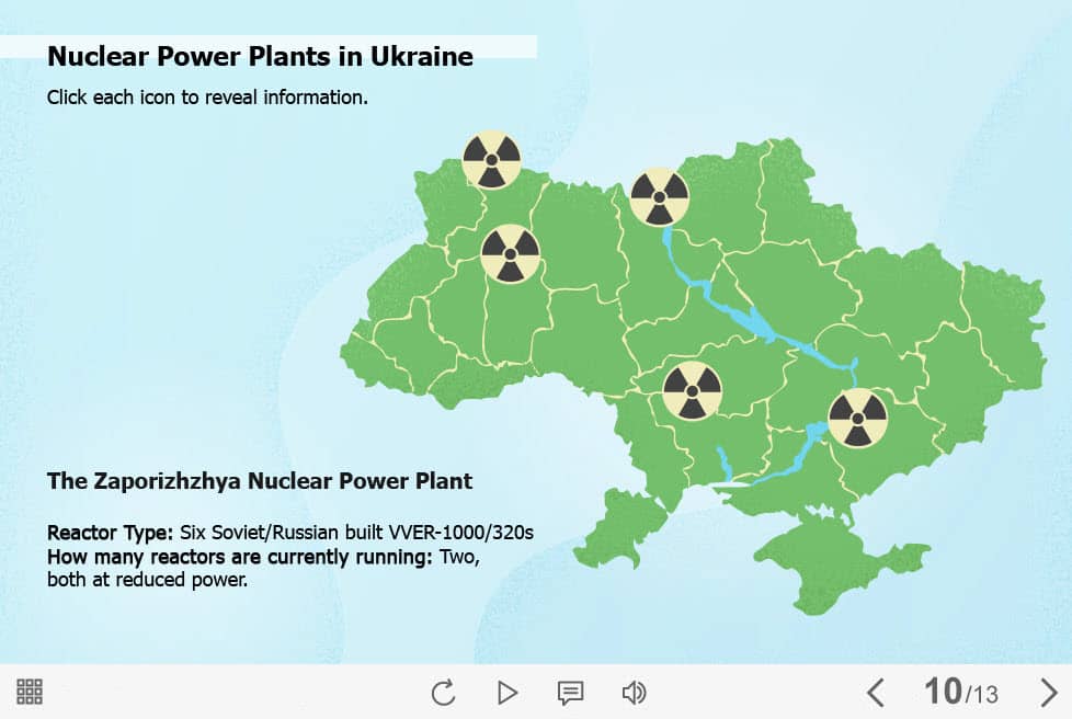 Nuclear Power Plants Markers — Captivate Template. The eLearning interaction slide would become a great addition for your eCourse. It contains five clickable markers designed as radioactive environment symbols. The user must click on each of them to reveal the additional information. The template is compatible with Captivate 2019 software. All you need is just to paste the template into your project and to fill it with own learning materials. Try to create better courses with our amazing Adobe Captivate templates!