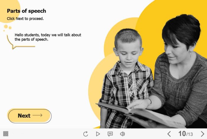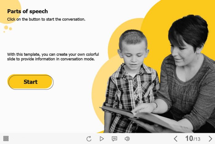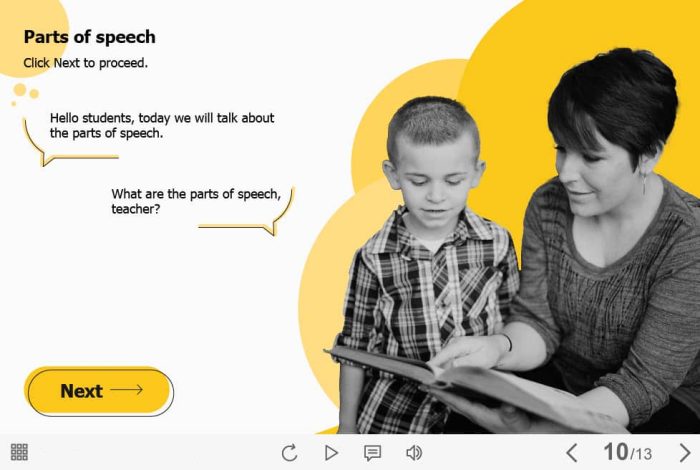 Parts of Speech — Captivate Template. The eLearning interaction slide would become a great addition for your eCourse. It is composed od 4 slides with learning materials represented as a dialogue between teacher and student. The user must the Start and Continue buttons to reveal the additional information. The template is compatible with Captivate 2019 software. All you need is just to paste the template into your project and to fill it with own learning materials. Try to create better courses with our amazing Adobe Captivate templates!