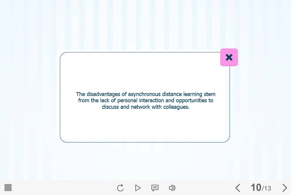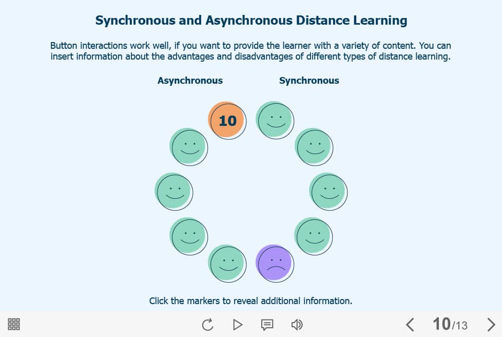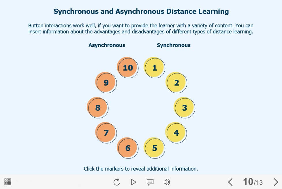 Distance Learning — Captivate Template. The eLearning interaction slide would become a great addition for your eCourse. It contains ten buttons with numbers that are arranged in the center of a screen. The user must click on each of them to reveal the additional information in pop-ups. The template is compatible with Captivate 2019 software. All you need is just to paste the template into your project and to fill it with own learning materials. Try to create better courses with our amazing Adobe Captivate templates!