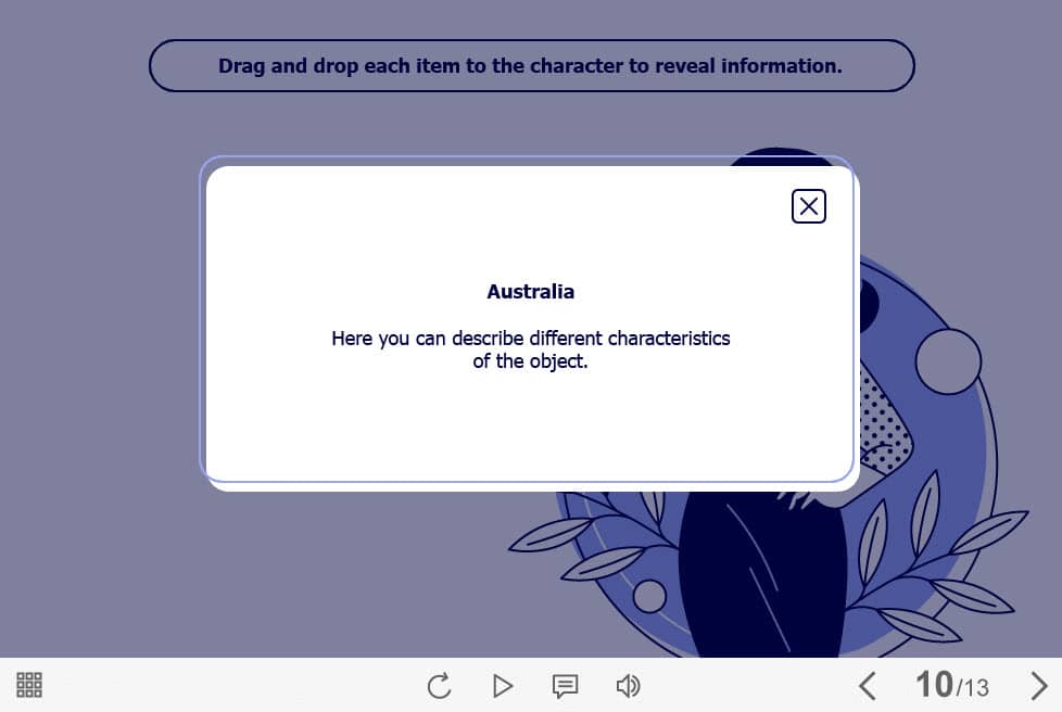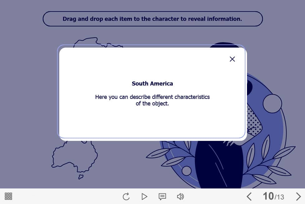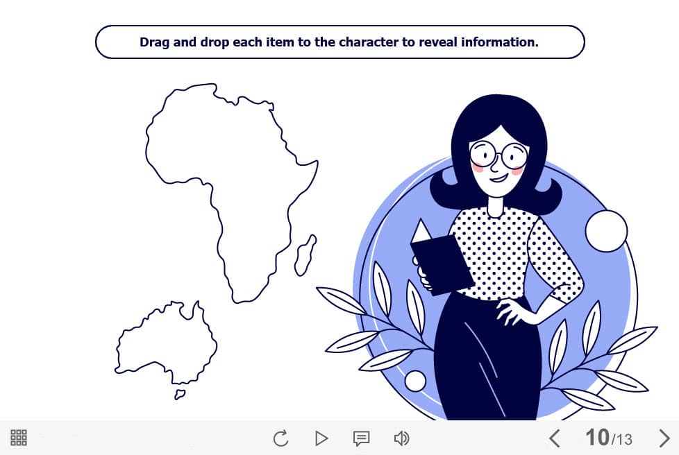 Draggable Continents — Captivate Template. The eLearning interaction slide would become a great addition for your eCourse. It contains three draggable objects designed as sillhouettes of continents. The user must drag and drop each of them on the character to reveal the additional information. The template is compatible with Captivate 2019 software. All you need is just to paste the template into your project and to fill it with own learning materials. Try to create better courses with our amazing Adobe Captivate templates!