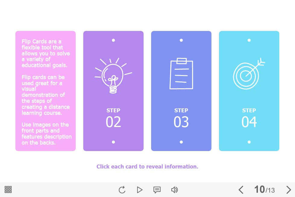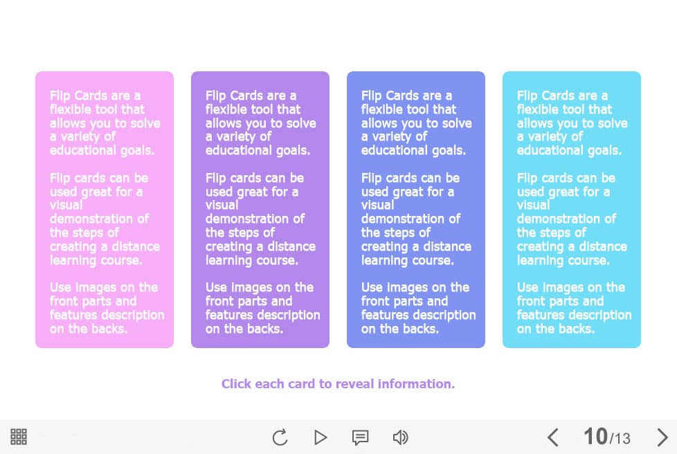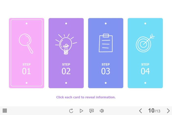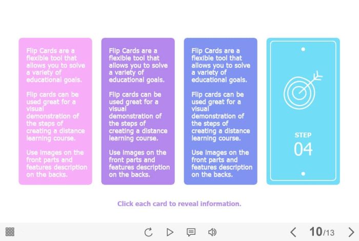 Colorful Flip Cards — Captivate Template. The eLearning interaction slide would become a great addition for your eCourse. It contains four flip cards. The user must click on each of them to reveal the additional information. The template is compatible with Captivate 2019 software. All you need is just to paste the template into your project and to fill it with own learning materials. Try to create better courses with our amazing Adobe Captivate templates!
