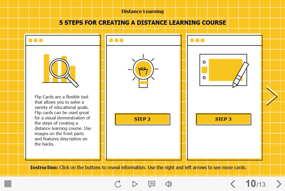 Flip Cards on Yellow Checkered Background — Captivate Template. The eLearning interaction slide would become a great addition for your eCourse. It contains five flip cards. The user must click on each of them to reveal the additional information. The template is compatible with Captivate 2019 software. All you need is just to paste the template into your project and to fill it with own learning materials. Try to create better courses with our amazing Adobe Captivate templates!