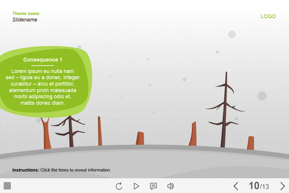 Click the Tree Stumps — Captivate Template. The eLearning interaction slide would become a great addition for your eCourse. It contains five buttons designed as tree stumps. The user must click on each stump to reveal the additional information. The template is developed with Adobe Captivate 9 authoring tool. It is compatible with the most recent Captivate 2017 / 2019 versions. All you need is just to paste the template into your project and to fill it with own learning materials. Try to create better courses with our amazing templates!