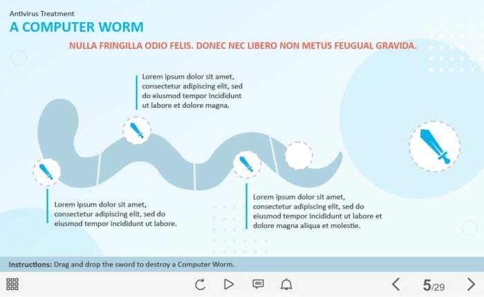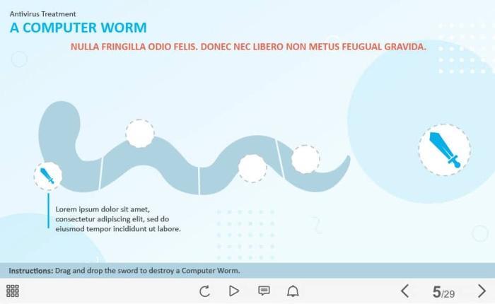 Drag`n`drop the Sword — Captivate Template. The unique eLearning interaction is designed with Captivate 2019 software. The user must drag the sword to the appropriate field sequentally from left to right to reveal the additional information. The template slide is a ready-made product: all you need is to insert it into the projects and fill with own training content. We recommend to launch it on the devices with the screen size more than 7 inches. We’ve collected lots of Adobe Captivate templates to speed up the course development and to save you from routine work.
