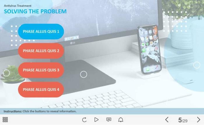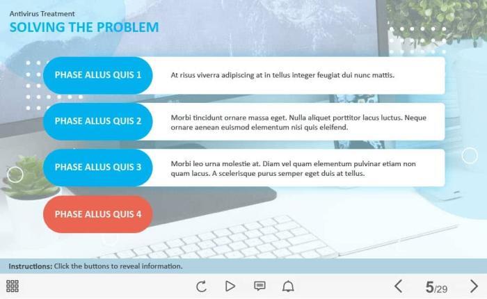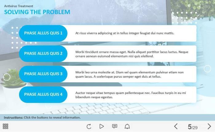 Four Steps — Captivate Template. The unique eLearning interaction is designed with Captivate 2019 software. The template contains four red buttons placed at the left part of the screen. The user must click on them to reveal the additional materials. The template slide is a ready-made product: all you need is to insert it into the projects and fill with own training content. We recommend to launch it on the devices with the screen size more than 7 inches. We’ve collected lots of Adobe Captivate templates to speed up the course development and to save you from routine work.
