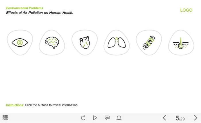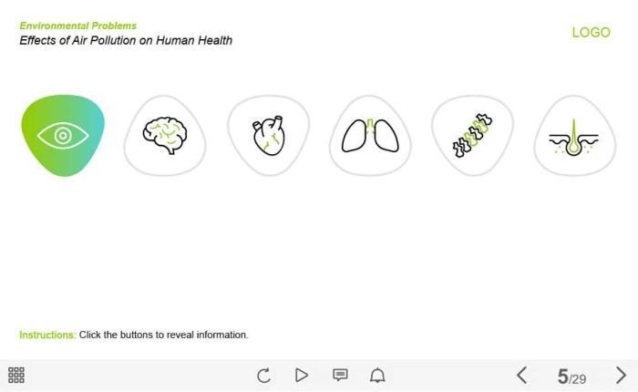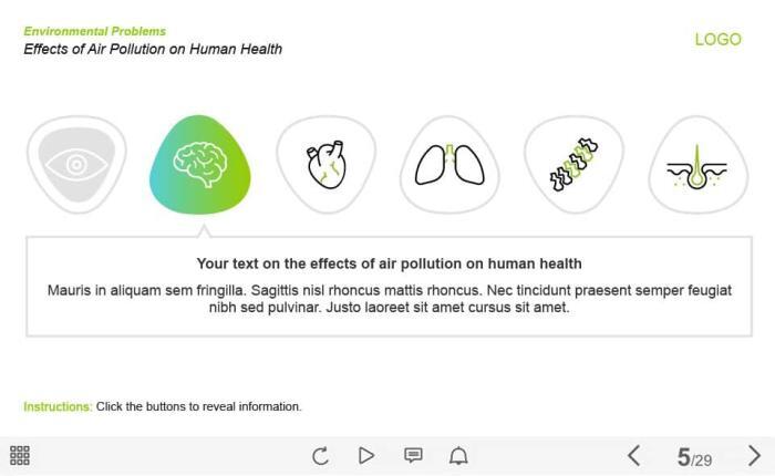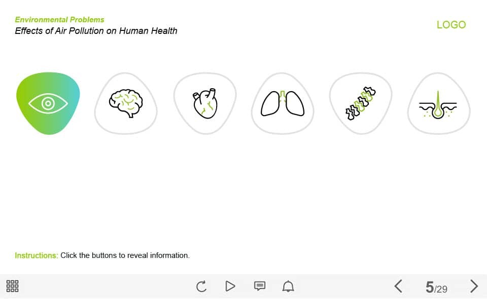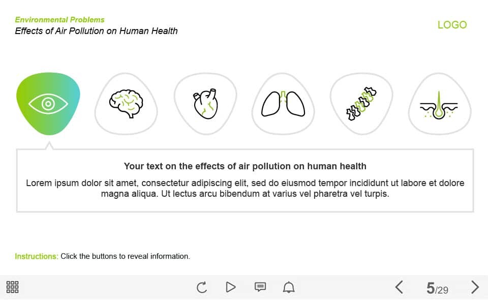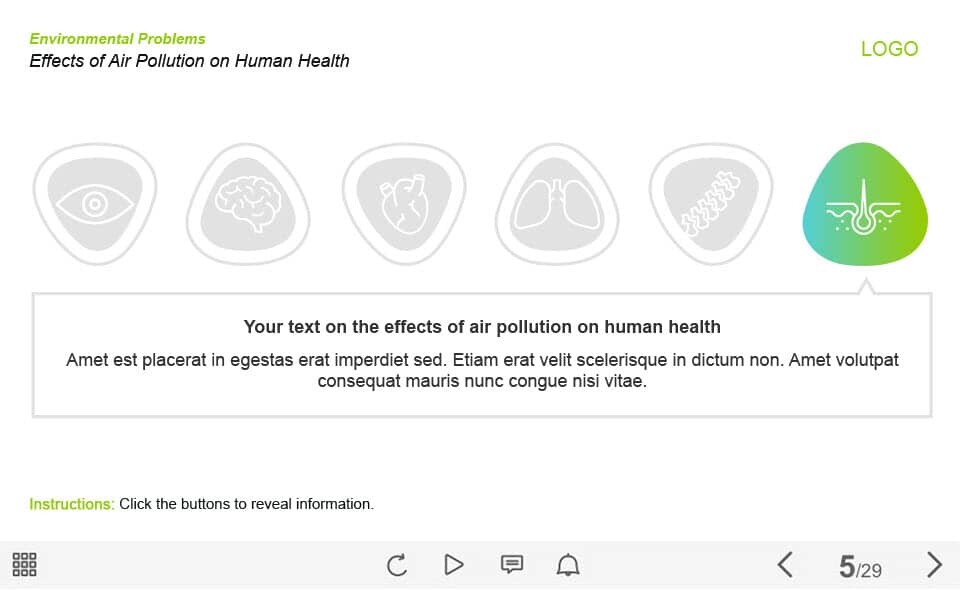 Body Organ Buttons — Captivate Template. The unique eLearning interaction is designed with Captivate 2019. The template contains 6 buttons placed at the center of the screen. The user must click each button to reveal the additional materials. The template slide is a ready-made product: all you need is to insert it into the projects and fill with own training content. It’s recommended to launch it on the devices with the screen size more than 7 inches.