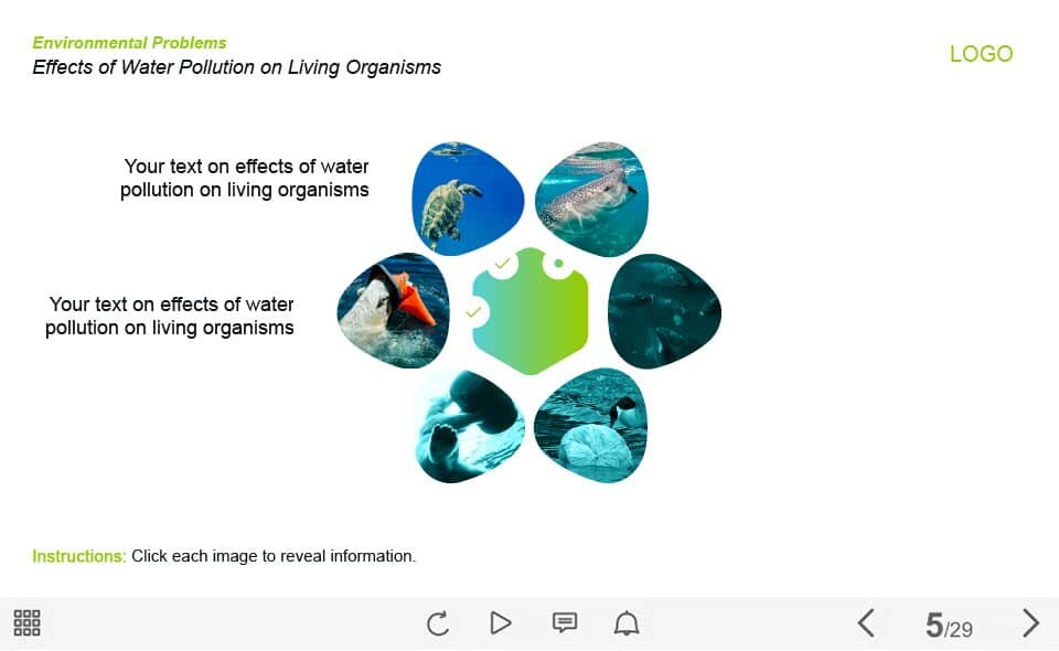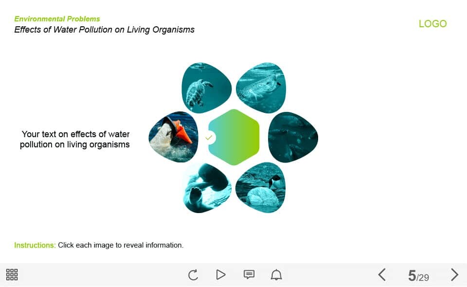Six Image Buttons — Captivate Template. The unique eLearning interaction is designed with Captivate 2019. The template contains 6 image buttons that are placed at the center of the screen. The user must click each marker to reveal the additional materials. The template slide is a ready-made product: all you need is to insert it into the projects and fill with own training content. It’s recommended to launch it on the devices with the screen size more than 7 inches.