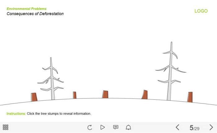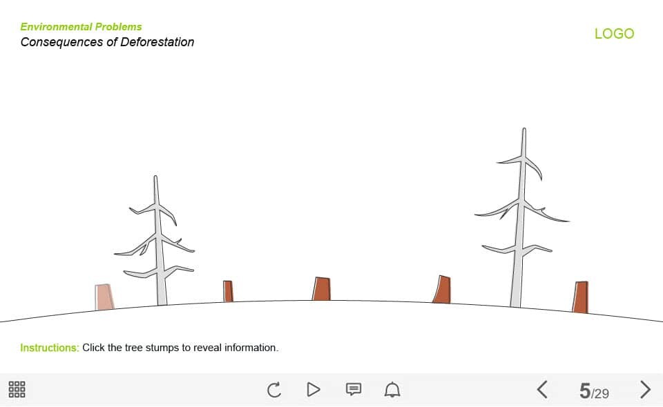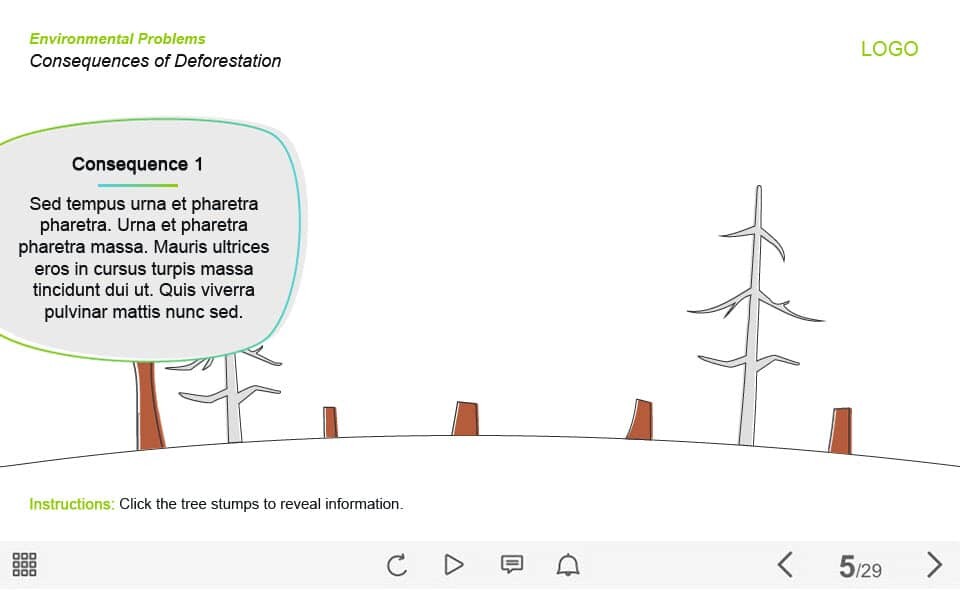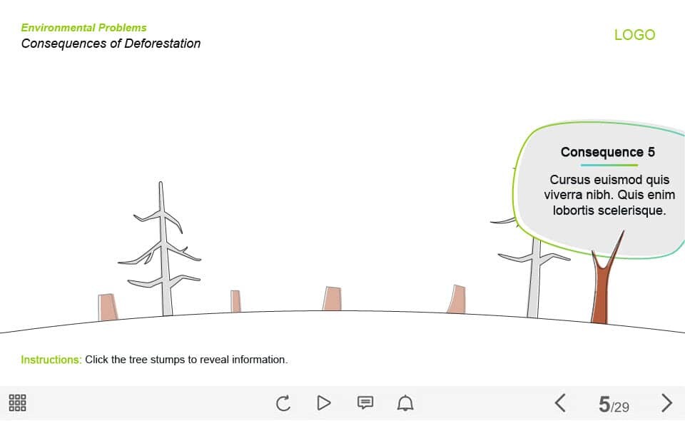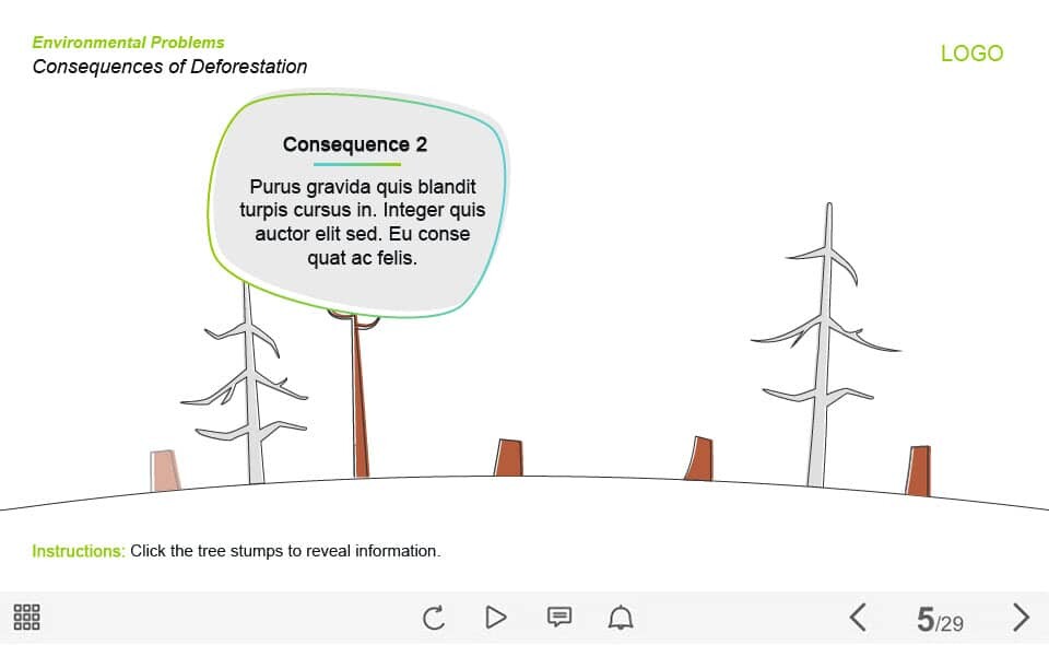 Clickable Tree Stumps — Captivate Template. The unique eLearning interaction is designed with Captivate 2019. The template contains 5 buttons designed as tree stumps. The user must click each of them to reveal the additional materials. The template slide is a ready-made product: all you need is to insert it into the projects and fill with own training content. It’s recommended to launch it on the devices with the screen size more than 7 inches.