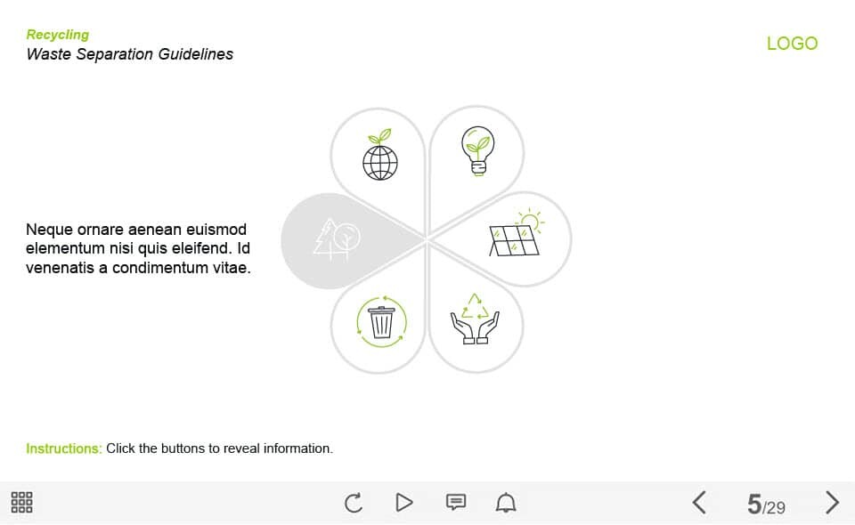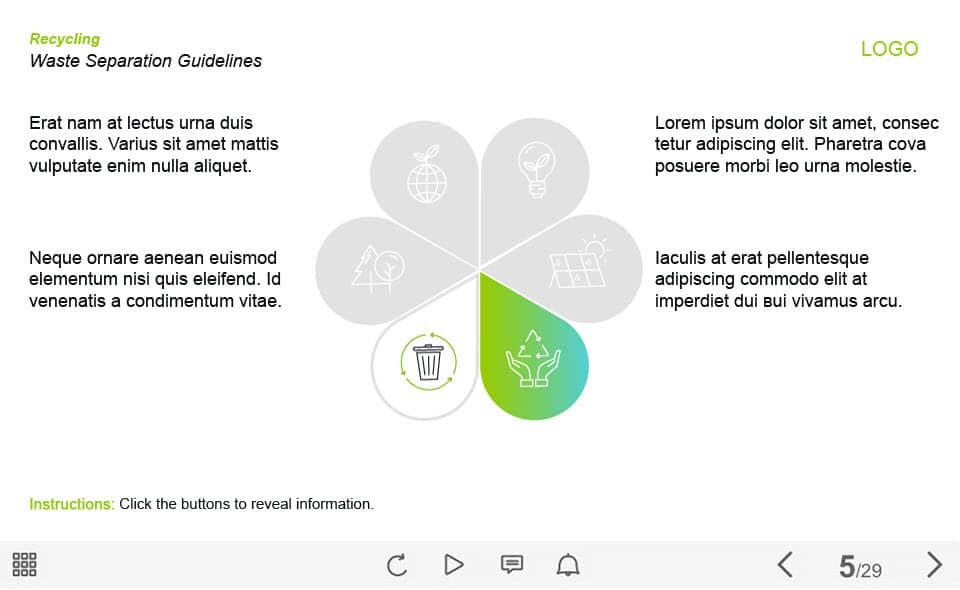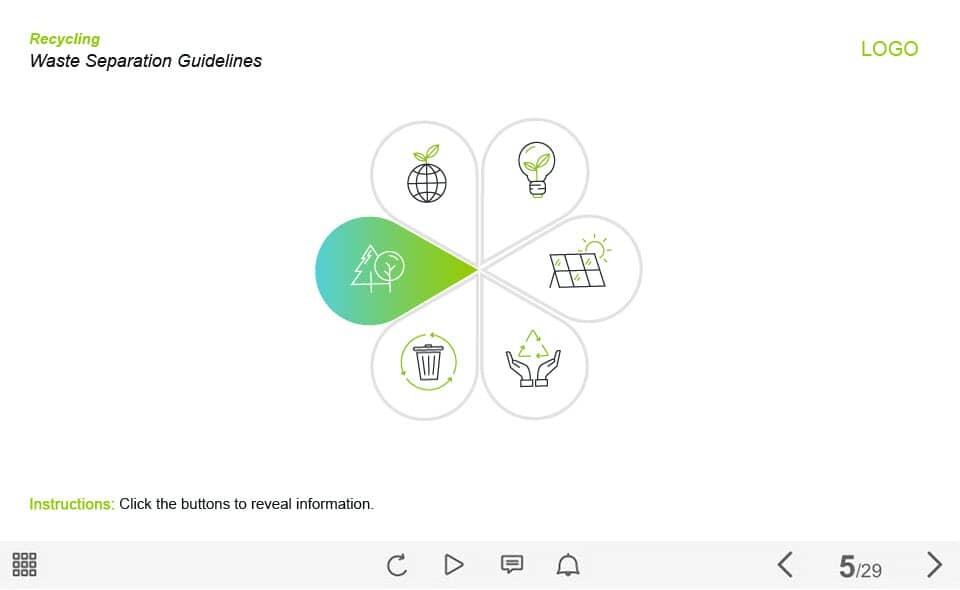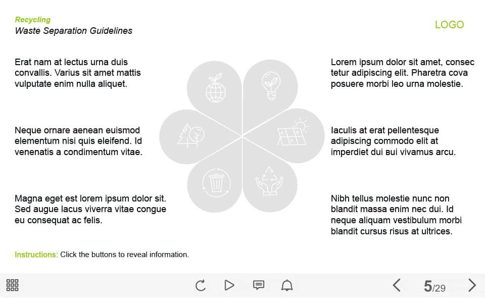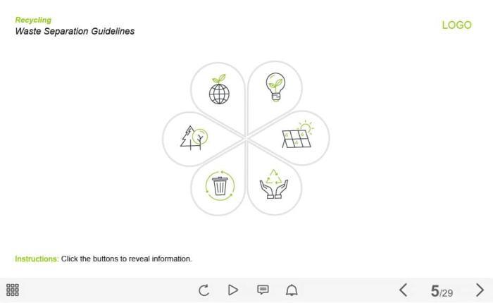Waste Separation Guide — Captivate Template. The unique eLearning interaction is designed with Captivate 2019 tool. The template contains 6 buttons placed on the slide. The user must click each of them to reveal the additional materials. The template slide is a ready-made product: all you need is to insert it into the projects and fill with own training content. It’s recommended to launch it on the devices with the screen size more than 7 inches.