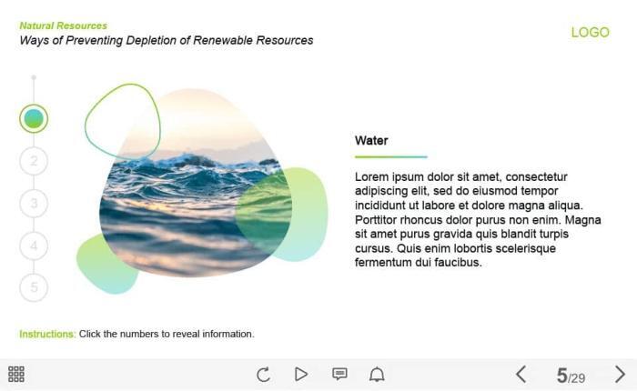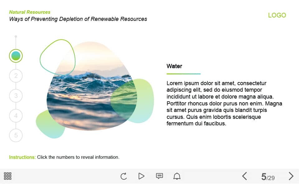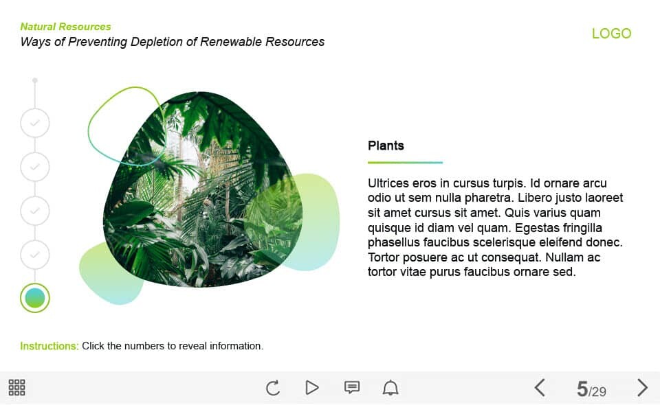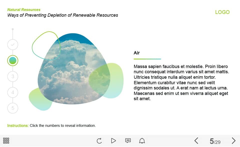 Vertical Timeline — Captivate Template. The unique eLearning interaction is designed with Captivate 2019 tool. The template contains a vertical timeline with five buttons. The user must click on each of them to reveal the additional materials. The template slide is a ready-made product: all you need is to insert it into the projects and fill with own training content. It’s recommended to launch it on the devices with the screen size more than 7 inches.