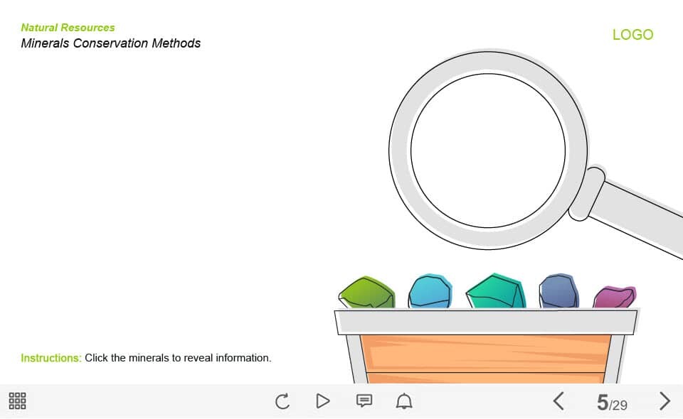 Clickable Minerals — Captivate Template. The unique eLearning interaction is designed with Captivate 2019 tool. The template contains 5 clickable objects designed as minerals. The user must click on each of them to reveal the additional materials. The template slide is a ready-made product: all you need is to insert it into the projects and fill with own training content. It’s recommended to launch it on the devices with the screen size more than 7 inches.