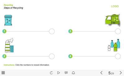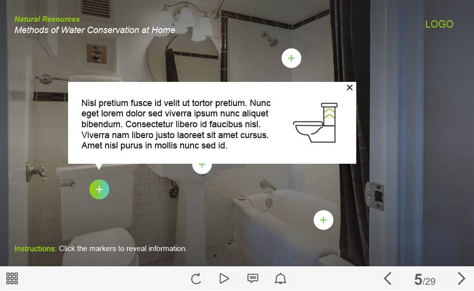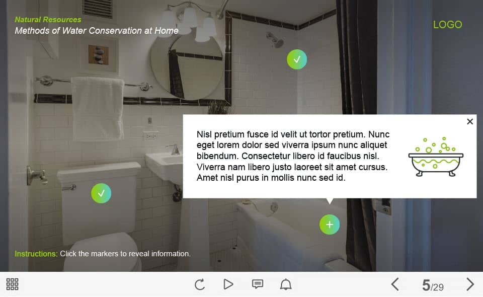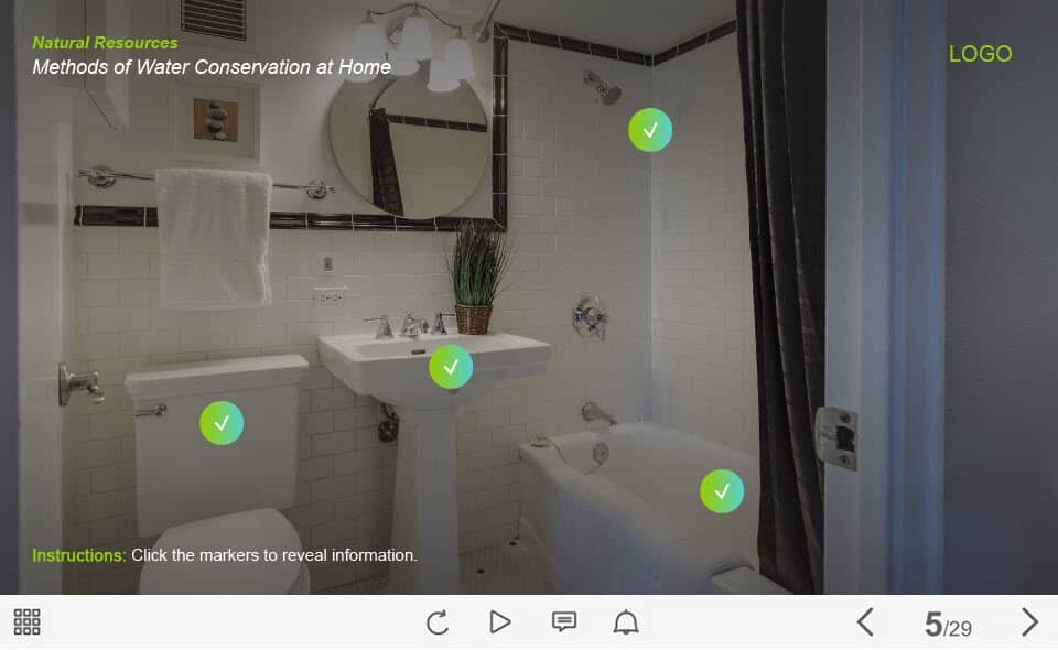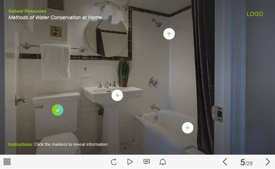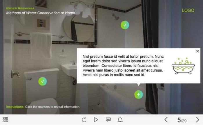 Water Conservation Markers — Captivate Template. The unique eLearning interaction is designed with Captivate 2019 tool. The template contains 4 clickable markers placed over the background image. The user must click each of them to reveal the additional materials. The template slide is a ready-made product: all you need is to insert it into the projects and fill with own training content. It’s recommended to launch it on the devices with the screen size more than 7 inches.