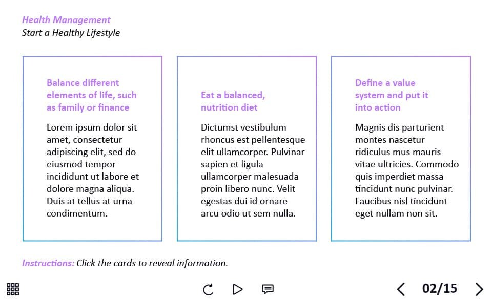 Healthy Living Flip Cards — Captivate Template. The unique eLearning interaction is designed with Adobe Captivate 2019 software. The template contains 3 flip cards. The user must click each of them to reveal the additional materials. The template is a ready-made product: all you need is to insert it into the projects and fill with own training content. It’s recommended to launch it on the devices with the screen size more than 7 inches.