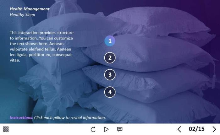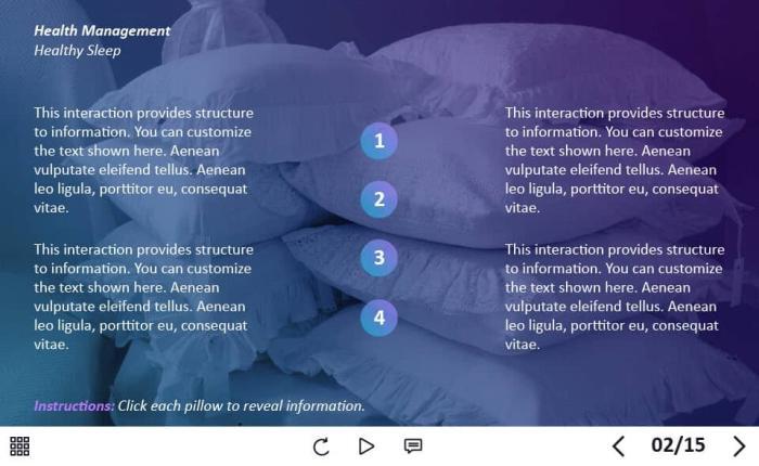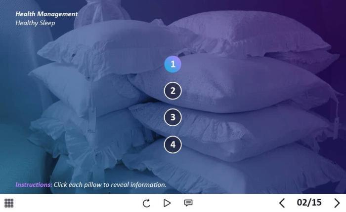 Healthy Sleep Buttons — Captivate Template. The unique eLearning interaction is designed with Adobe Captivate 2019 software. The template contains 4 round buttons with numbers. The user must click each of them to reveal the additional materials. The template is a ready-made product: all you need is to insert it into the projects and fill with own training content. It’s recommended to launch it on the devices with the screen size more than 7 inches.