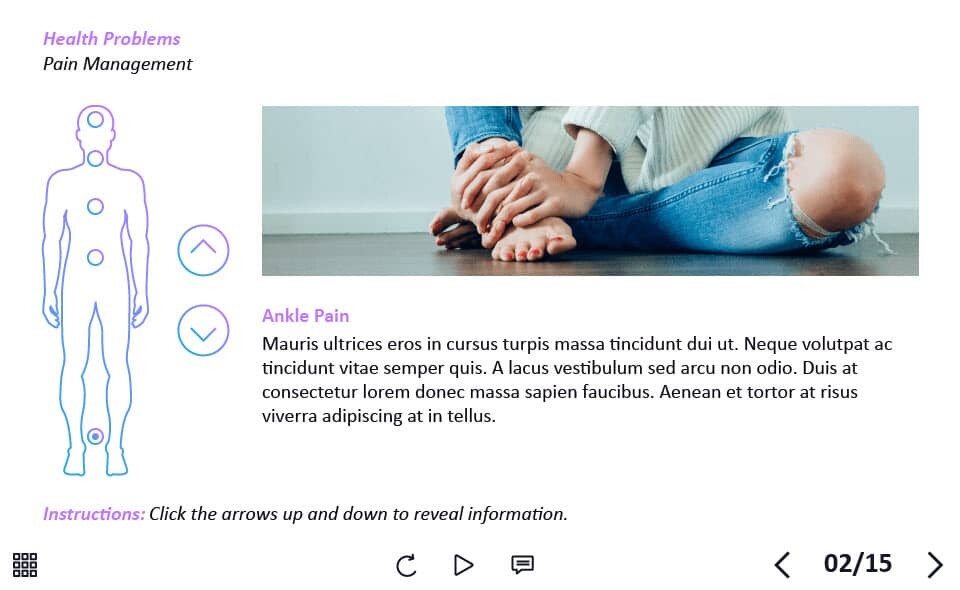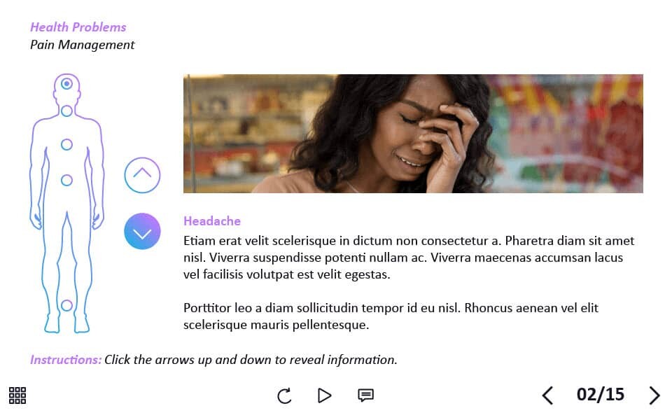 Pain Management Slideshow — Captivate Template. The unique eLearning interaction is designed with Adobe Captivate 2019 software. The template a classic slideshow with a progress bar on the left. The user must click on the up and down arrows to switch between the slides and reveal the additional materials about different areas of pain. The template is a ready-made product: all you need is to insert it into the projects and fill with own training content. It’s recommended to launch it on the devices with the screen size more than 7 inches.