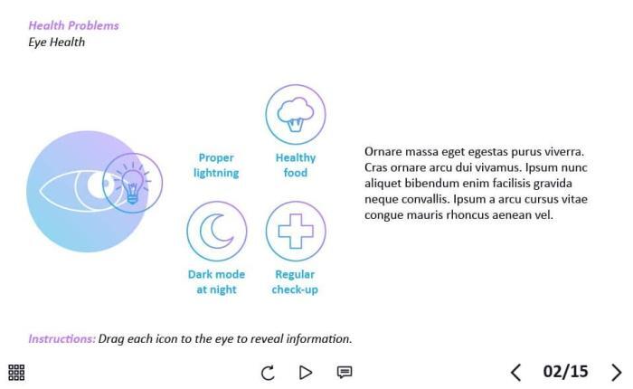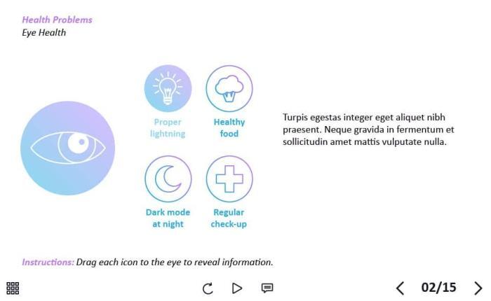 Eye Health Agents — Captivate Template. The unique eLearning interaction is designed with Adobe Captivate 2019 software. The template contains 4 draggable objects designed as icons. The user must drag each of them to the eye picture to reveal the additional materials. The template is a ready-made product: all you need is to insert it into the projects and fill with own training content. It’s recommended to launch it on the devices with the screen size more than 7 inches.