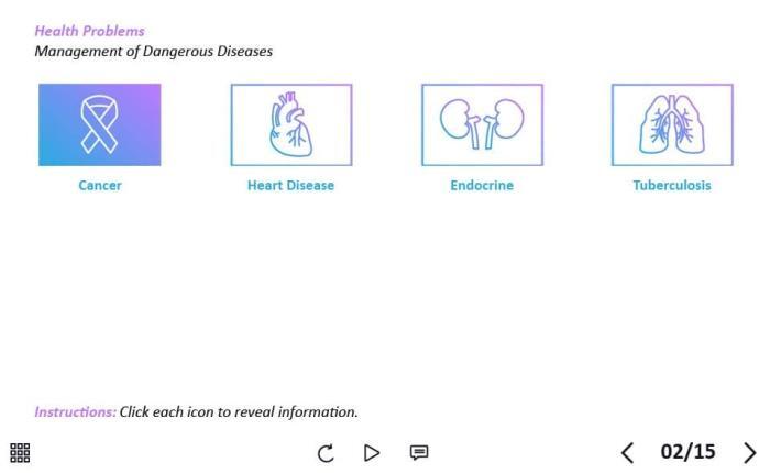 Dangerous Diseases Buttons — Captivate Template. The unique eLearning interaction is designed with Captivate 2019 software. The template contains 4 buttons illustrated with thematic icons. The user must click each of them to reveal the additional materials. The template is a ready-made product: all you need is to insert it into the projects and fill with own training content. It’s recommended to launch it on the devices with the screen size more than 7 inches.