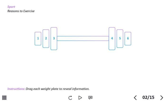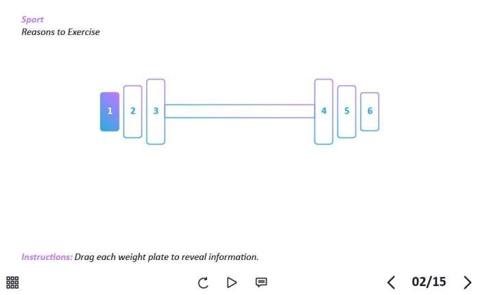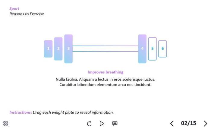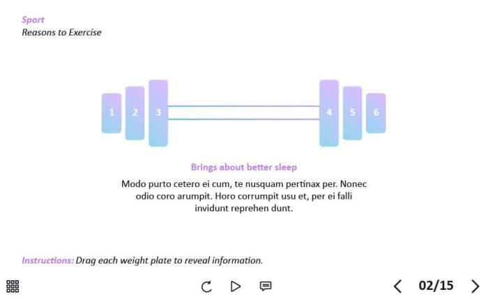 Sport Exercise Reasons — Captivate Template. The unique eLearning interaction is designed with Captivatw 2019 software. The template contains 6 tabs designed as rod composite discs. The user must click each of them to reveal the additional materials. The template is a ready-made product: all you need is to insert it into the projects and fill with own training content. It’s recommended to launch it on the devices with the screen size more than 7 inches.