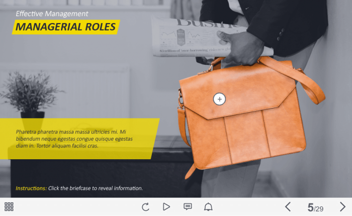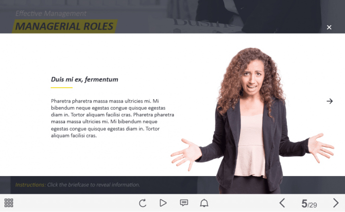 Slideshow in Pop-up — Captivate Template. The unique eLearning interaction is designed with Captivate 2019 software. The template contains 5 tabs placed at the right part of the screen. The user must click each of them to reveal the additional materials. The template slide is a ready-made product: all you need is to insert it into the projects and fill with own training content. It’s recommended to launch it on the devices with the screen size more than 7 inches.