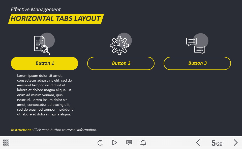 Three Horizontal Buttons — Captivate Template. The unique eLearning interaction is designed with Captivate 2019 software. The template contains 3 clickable buttons. The user must click each of them to reveal the additional materials. The template slide is a ready-made product: all you need is to insert it into the projects and fill with own training content. It’s recommended to launch it on the devices with the screen size more than 7 inches.
