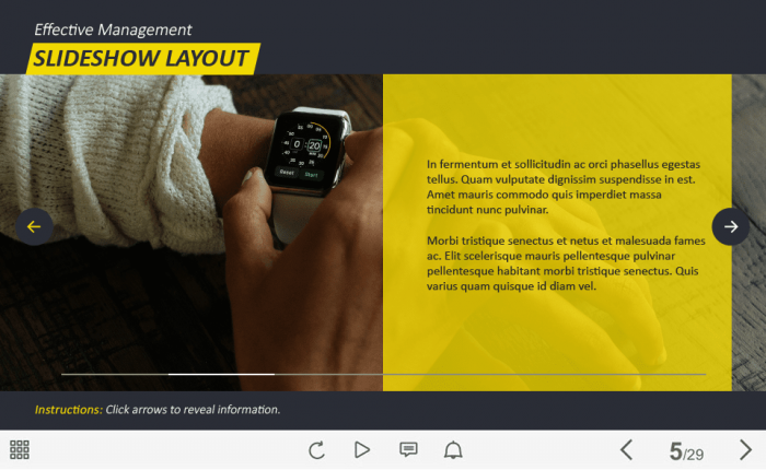 Horizontal Slideshow — Captivate Template. The unique eLearning interaction is designed with Captivate 2019 software. The template represents a well-designed horizontal slideshow. The user must click the left and right arrows to switch between the slides and reveal the additional materials. The template slide is a ready-made product: all you need is to insert it into the projects and fill with own training content. It’s recommended to launch it on the devices with the screen size more than 7 inches.