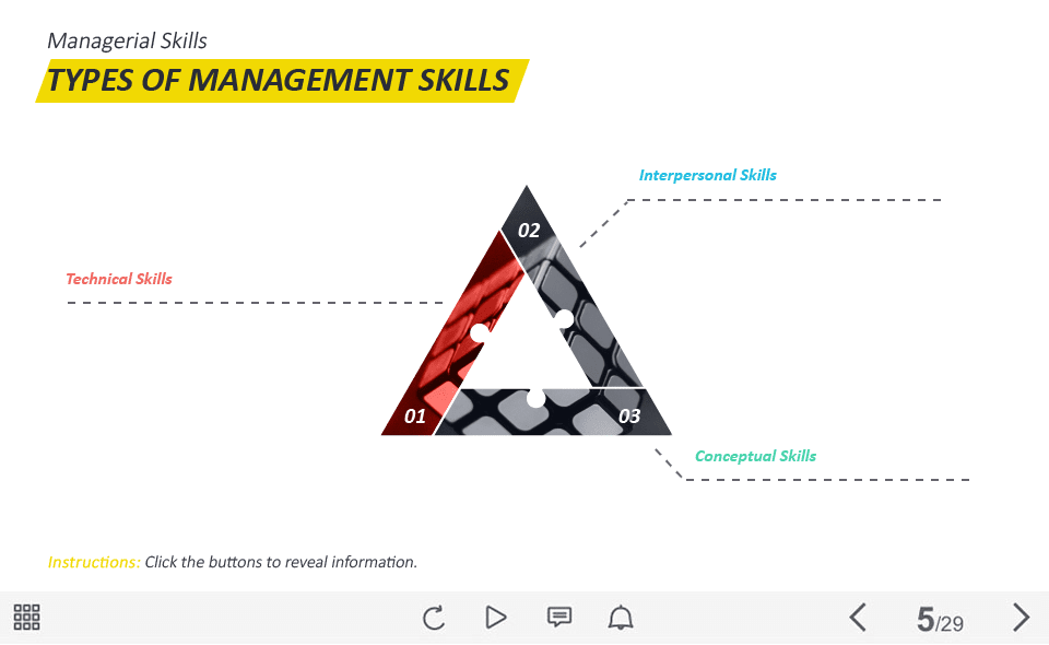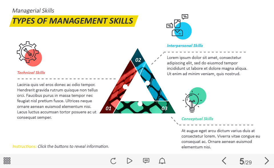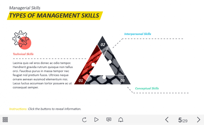 Management Skill Buttons — Captivate Template. The unique eLearning interaction is designed with Captivate 2019 software. The template contains 3 buttons placed at the center of the screen. The user must click each of them to reveal the additional materials. The template slide is a ready-made product: all you need is to insert it into the projects and fill with own training content. It’s recommended to launch it on the devices with the screen size more than 7 inches.