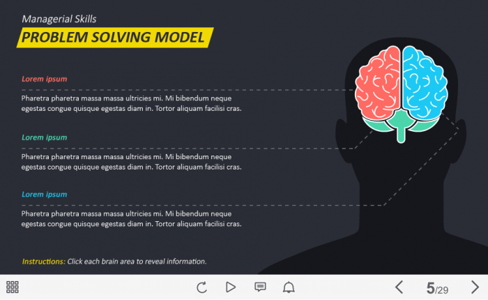 Problem Solving Model Buttons — Captivate Template. The unique eLearning interaction is designed with Captivate 2019 software. The template contains 3 buttons designed as parts of human brain. The user must click each of them to reveal the additional materials. The template slide is a ready-made product: all you need is to insert it into the projects and fill with own training content. It’s recommended to launch it on the devices with the screen size more than 7 inches.