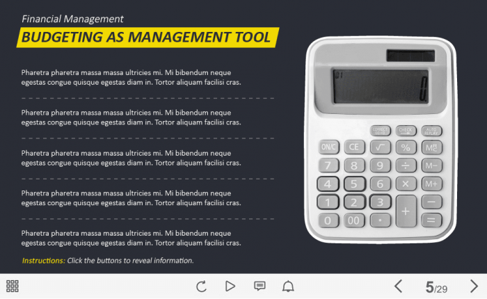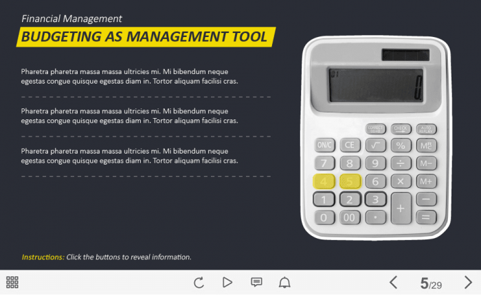 Calculator Buttons — Captivate Template. The unique eLearning interaction is designed with Captivate 2019 software. The template contains 5 clickable objects designed as calculators’ buttons. The user must click each of them to reveal the additional materials. The template slide is a ready-made product: all you need is to insert it into the projects and fill with own training content. It’s recommended to launch it on the devices with the screen size more than 7 inches.