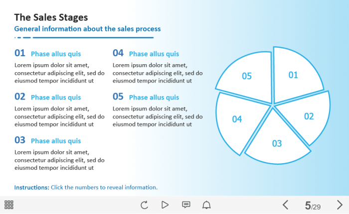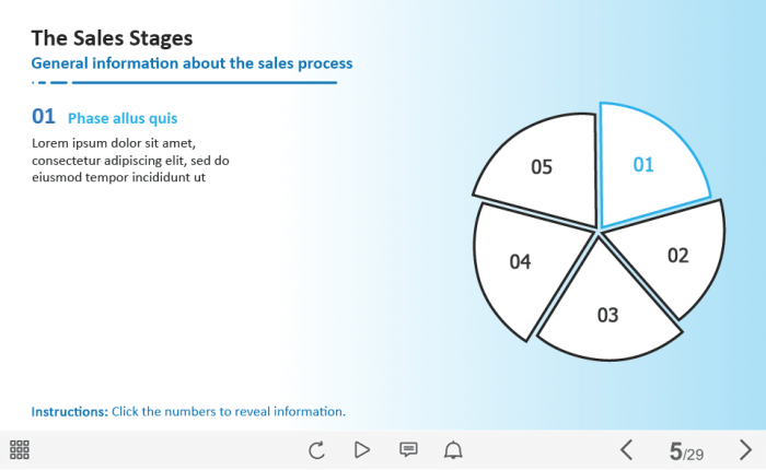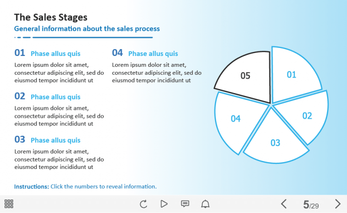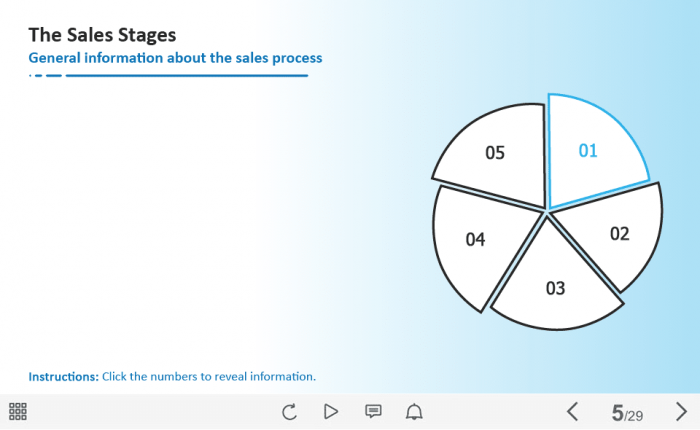 The Sales Stages Buttons — Captivate Template. The unique eLearning interaction is designed with Adobe Captivate 2019 software. The template contains five buttons placed on the right side of the screen in the form of a circle. The user must click on each button to reveal the additional information. The template slide is a ready-made product: all you need is to insert it into the projects and fill with own training content. We recommend to launch it on the devices with the screen size more than 7 inches. We’ve collected lots of Adobe Captivate templates to speed up the course development and to save you from routine work.