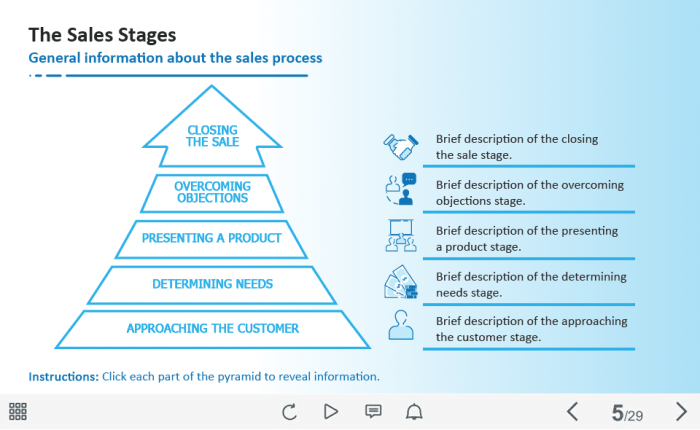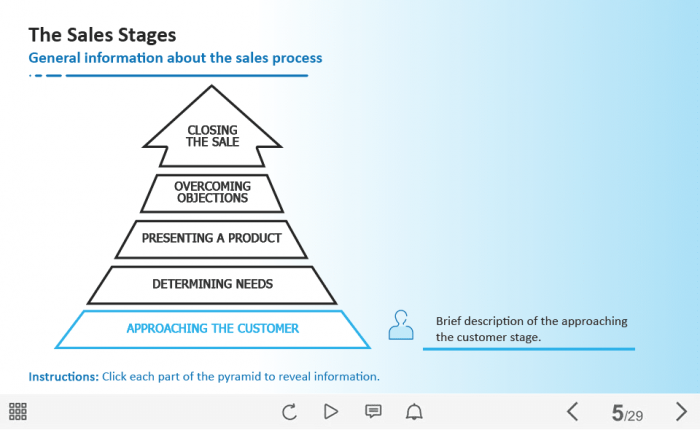 The Arrow-style Sales Stages — Captivate Template. The unique eLearning interaction is designed with Adobe Captivate 2019 software. The template contains five buttons placed on the left side of the screen. The user must click on each button to reveal the additional information. The template slide is a ready-made product: all you need is to insert it into the projects and fill with own training content. We recommend to launch it on the devices with the screen size more than 7 inches. We’ve collected lots of Adobe Captivate templates to speed up the course development and to save you from routine work.