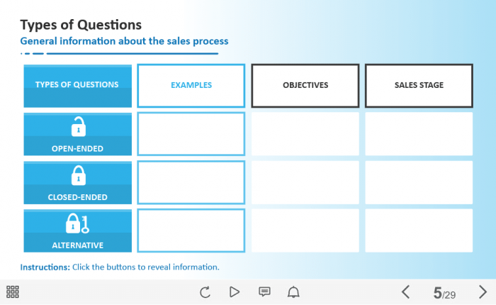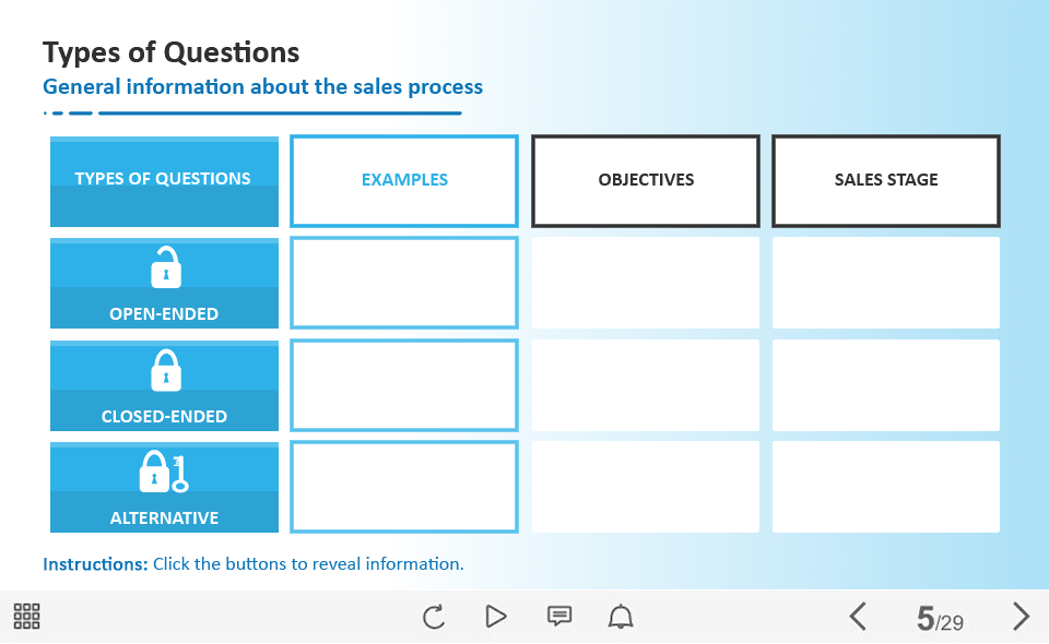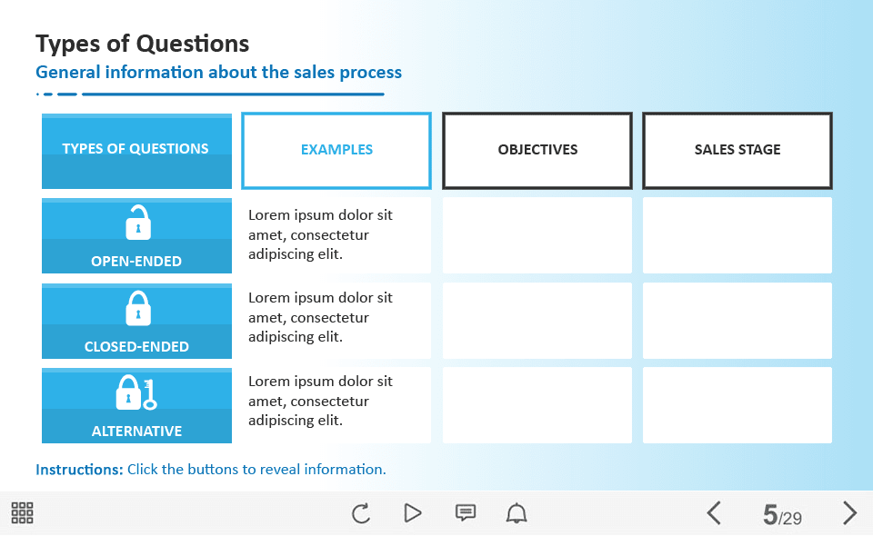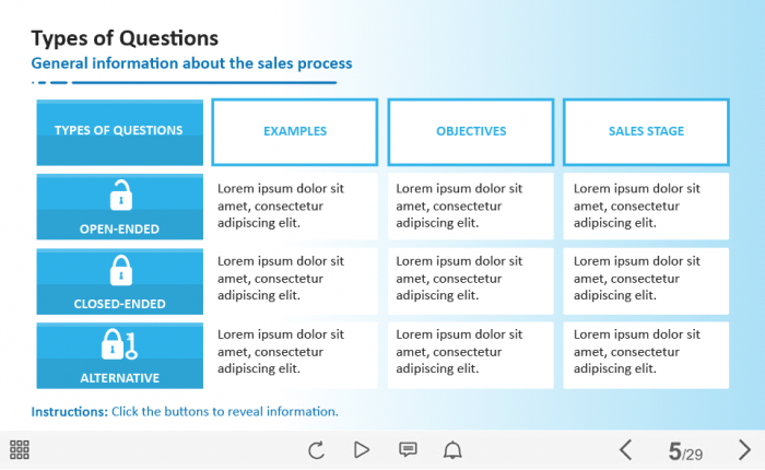Table with Three Buttons — Captivate Template. The unique eLearning interaction is designed with Adobe Captivate 2019 software. The template contains three buttons placed on the top side of the screen. The user must click on each button to reveal the additional information in cells. The template slide is a ready-made product: all you need is to insert it into the projects and fill with own training content. We recommend to launch it on the devices with the screen size more than 7 inches. We’ve collected lots of Adobe Captivate templates to speed up the course development and to save you from routine work.