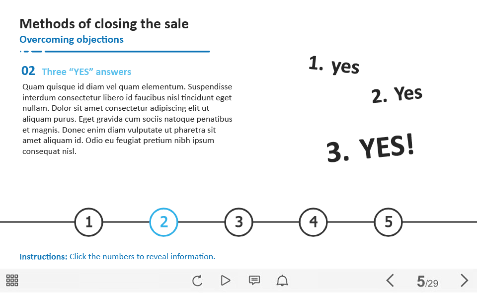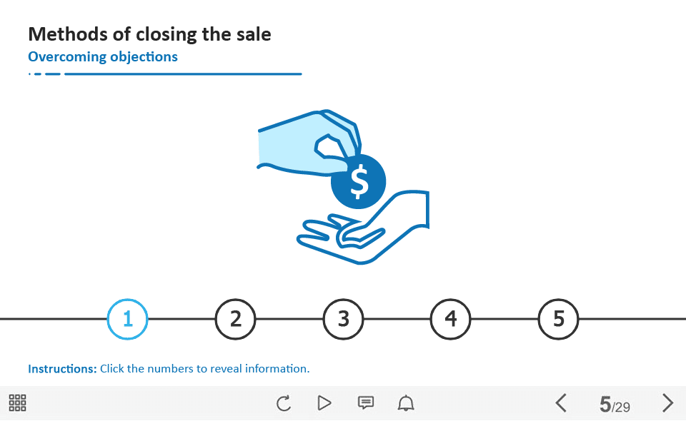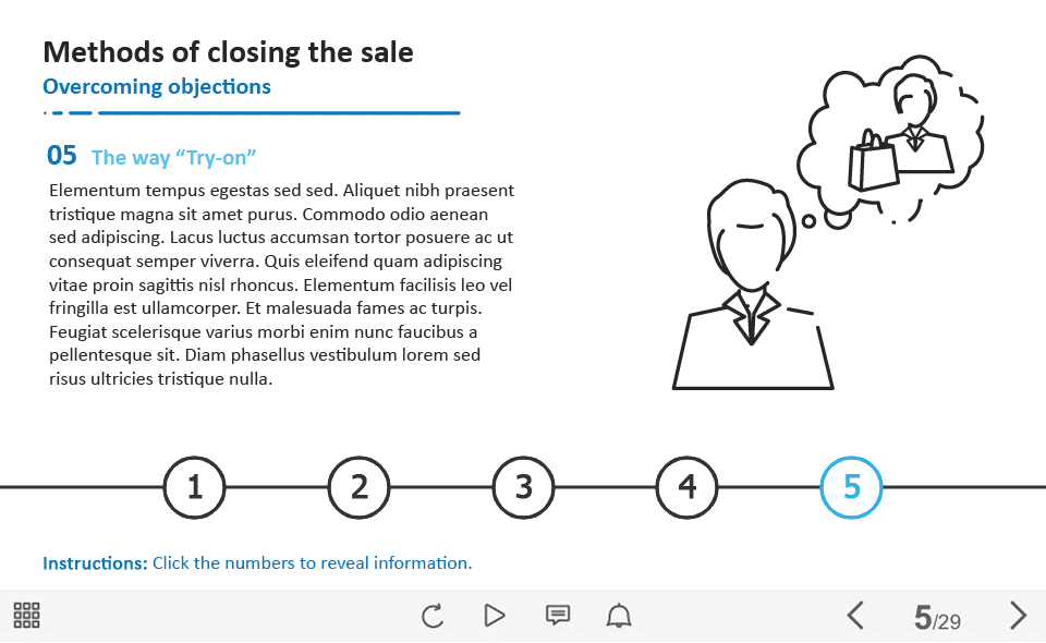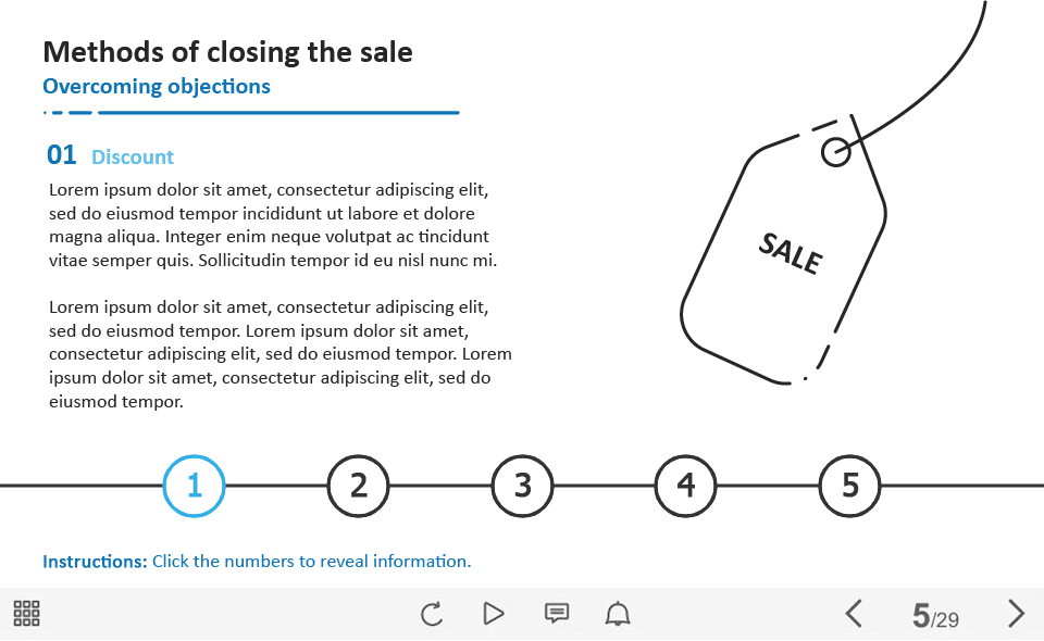 Closing the Sale Tabs — Captivate Template. The unique eLearning interaction is designed with Adobe Captivate 2019 software. The template contains five numerix tabs. The user must click on each tab to reveal the additional information. The template slide is a ready-made product: all you need is to insert it into the projects and fill with own training content. We recommend to launch it on the devices with the screen size more than 7 inches. We’ve collected lots of Adobe Captivate templates to speed up the course development and to save you from routine work.